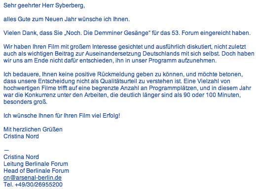 Denn die Leiterin der Jury schrieb aus drücklch, dass "die Entscheidung nicht als Qualitätsurteil zu verstehenn ist" und verweist ausdrücklich auf das Thema Deutschland als zuviel zum Grund der Ablehung (zuviel und zu lang unter anderem "hochwertigem" Angebot.).