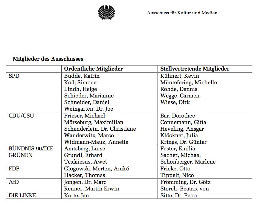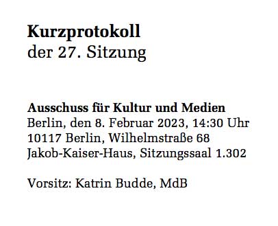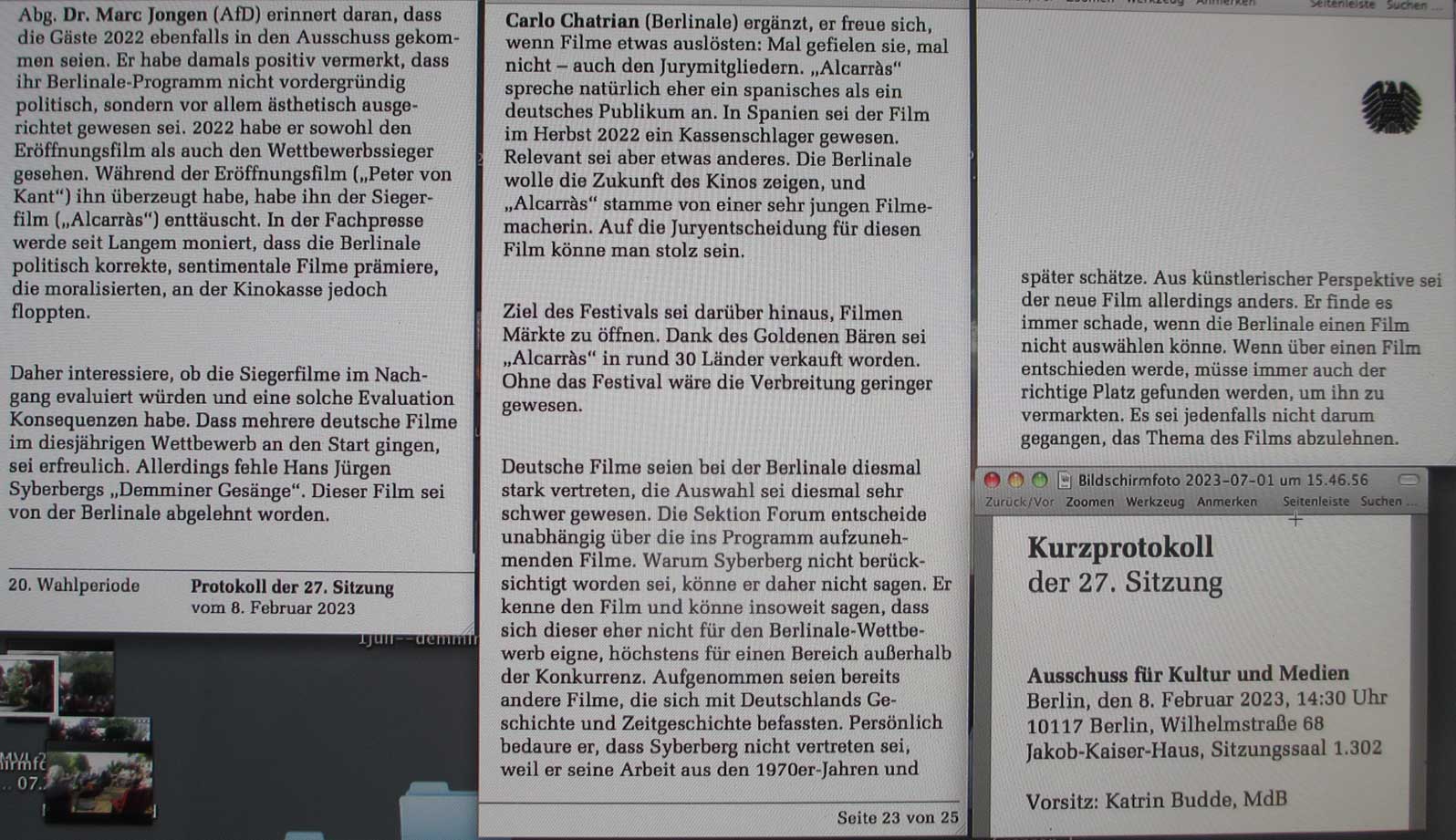 Nik. der aufmerksame, gab den Hinweis. Demmin, Die "Demminer Gesänge" im Bundestag. Ausschussitzung Kultur und Medien. Und Warum dieser Film nicht in der Berlinale gezeigt wurde. Wieviel Millionen Steuergelder in der Berlinale, plus Erhöhungen... Also angemessene Fragen, sollte man meinen, denn der Film hat auch sehr politische Aspekte - mit aktuellen Folgen.