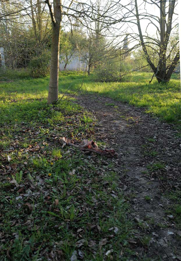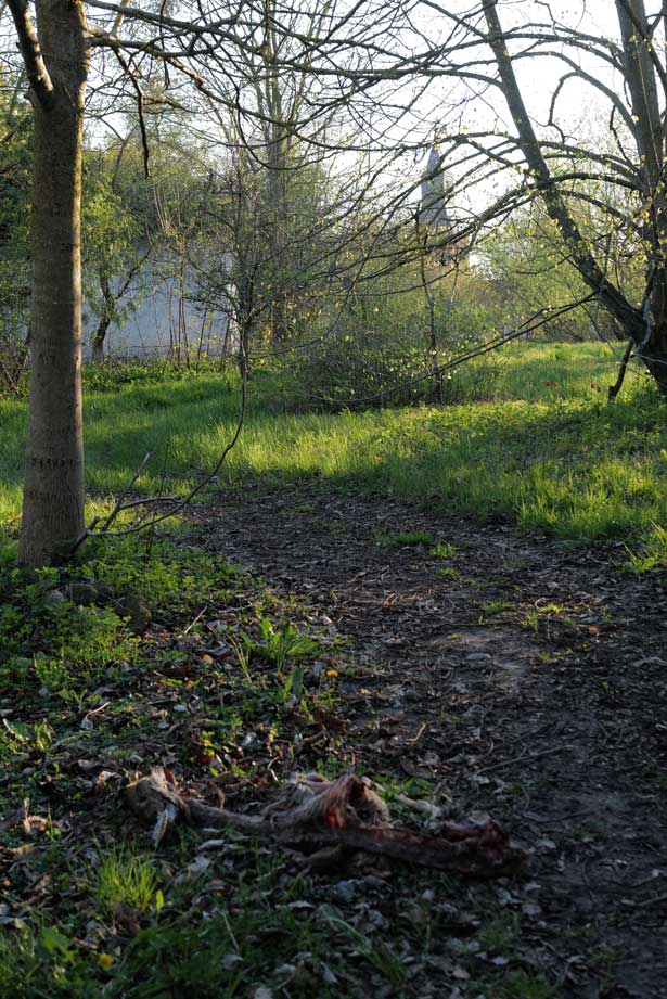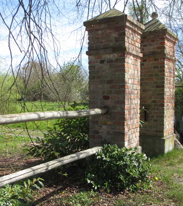Vom Feld, über die Brücke, und die Koppeln durchquerend, am A-Haus vorbei, zum Haus hier. Jetzt unter den Turm.