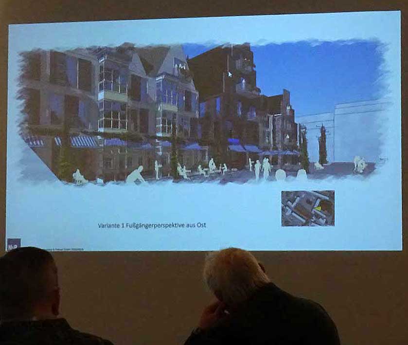 Dieser Chor der Bürger aus St. Bartholomaei sollte endlich seinen Raum zum Proben kriegen in der Mitte des Plazes an der Marktsüdseite und damit die Finanzierung sichern des Ganzen. Und noch was rundum, was alles dem Neuen der Stadt dienen könnte.