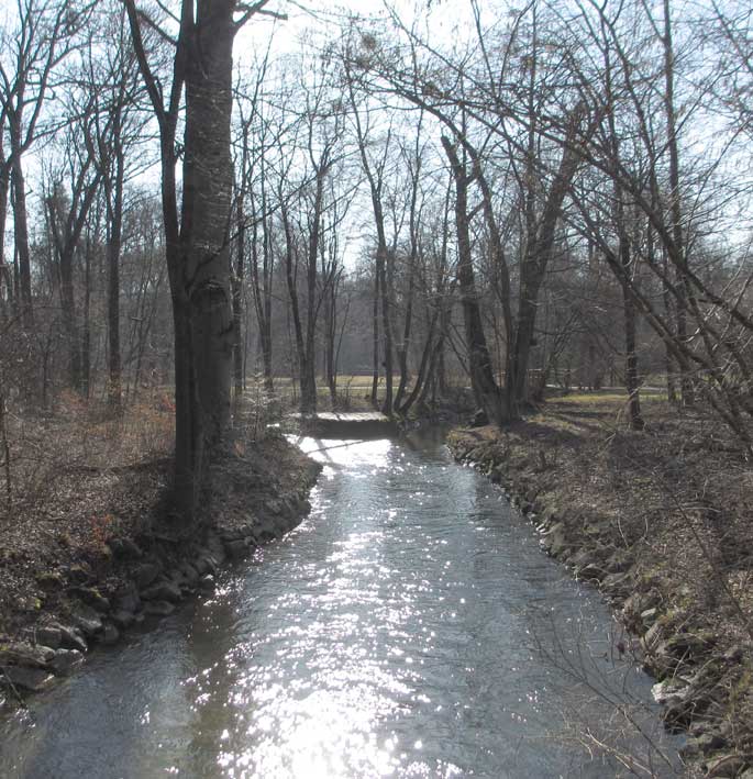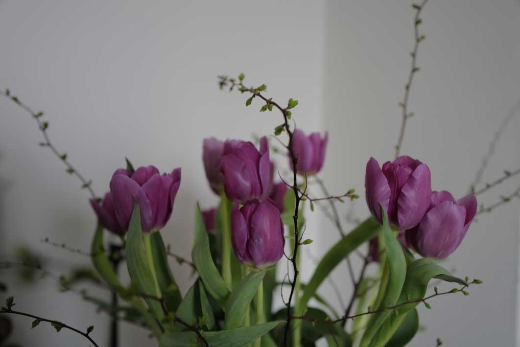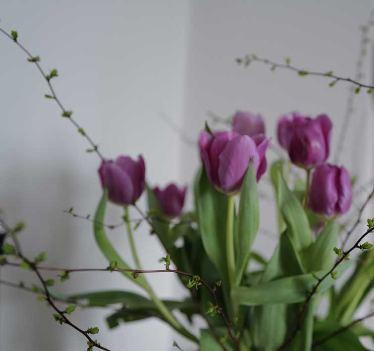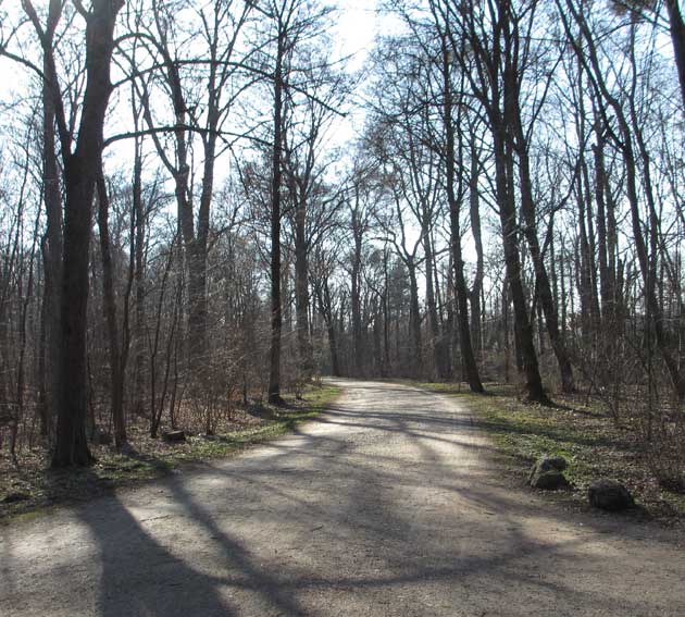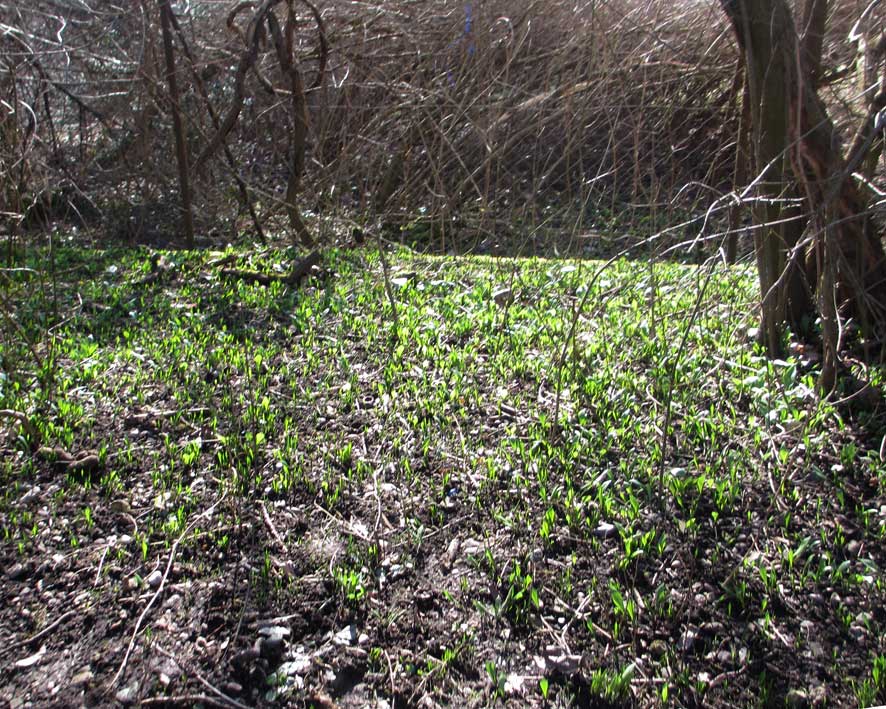 Auch der Bärlauch ist schon da, grün die Spitzen im Silbergrau der Sträucher und des Laubs im Gegenlicht