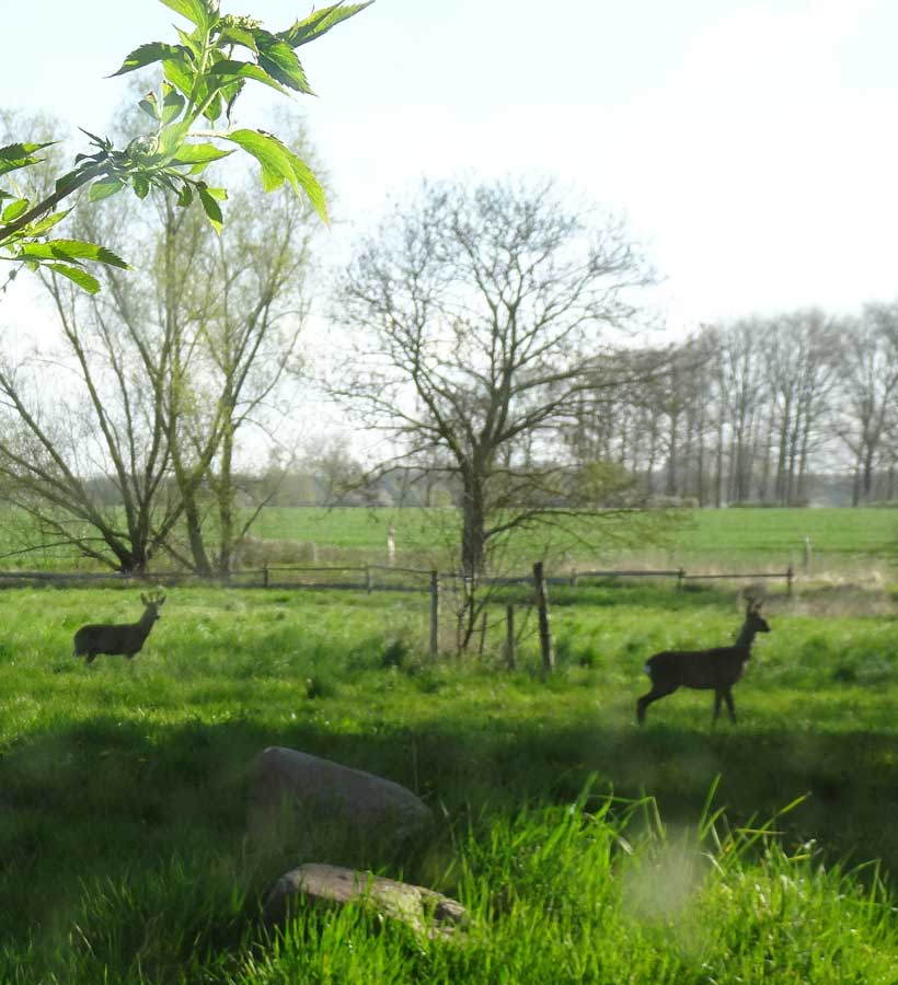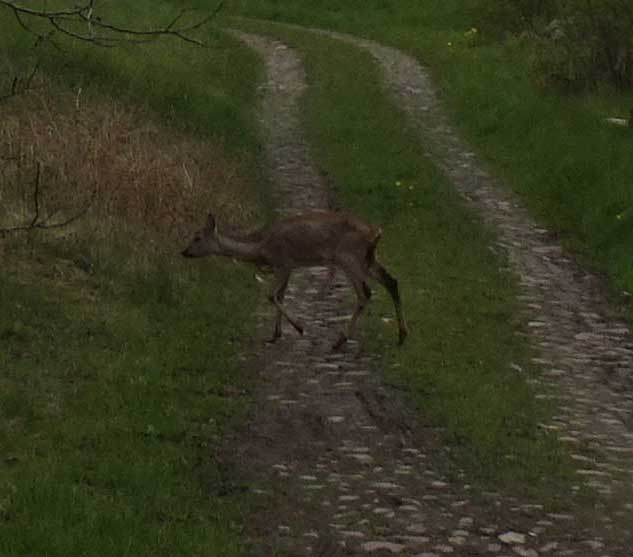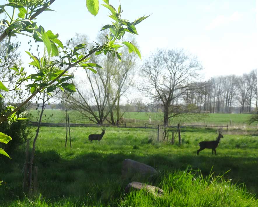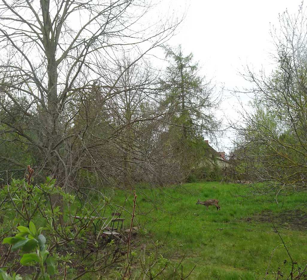 Es ist auch die Zeit der Rehe. Junge Böcke bis ans Haus. Über die Koppeln, zu den Rosenknospen, bald kommen die Sprünge.