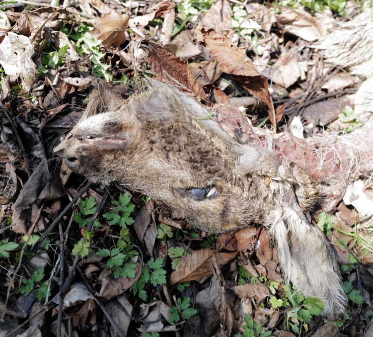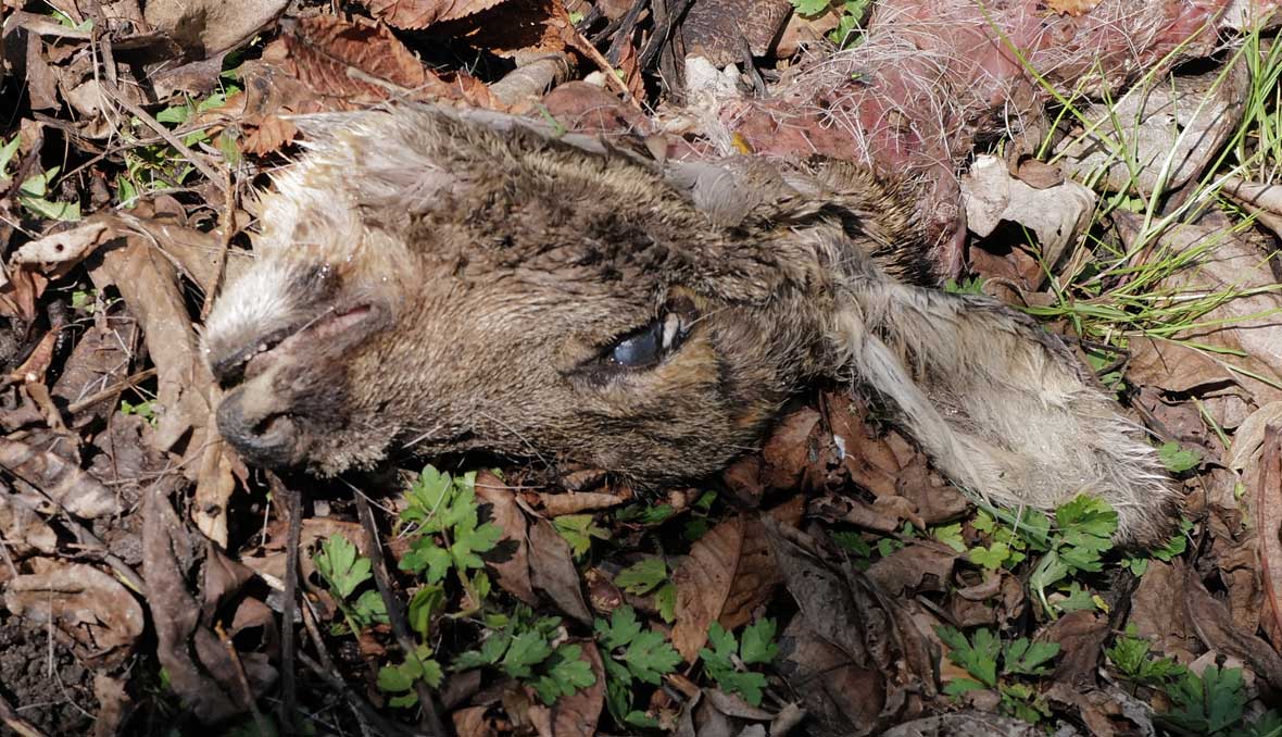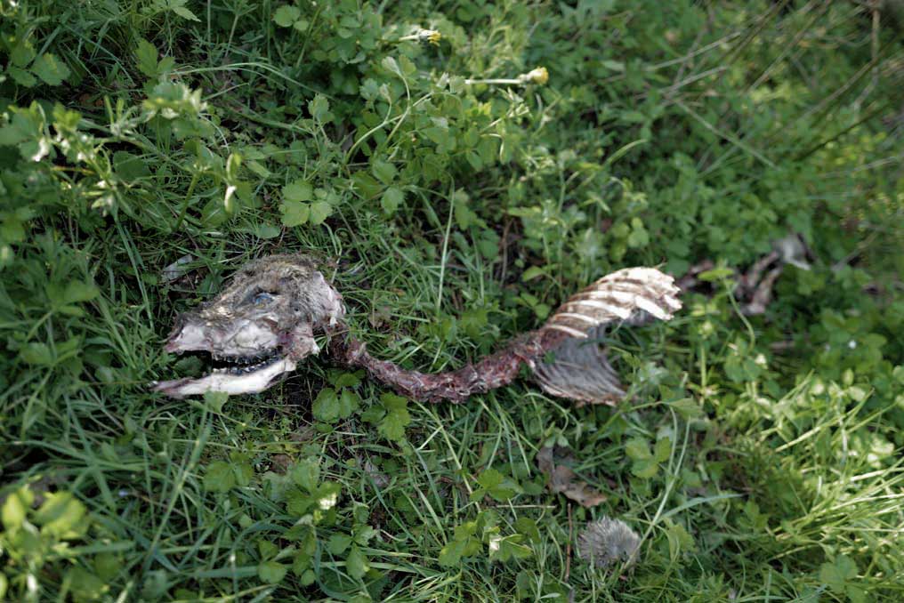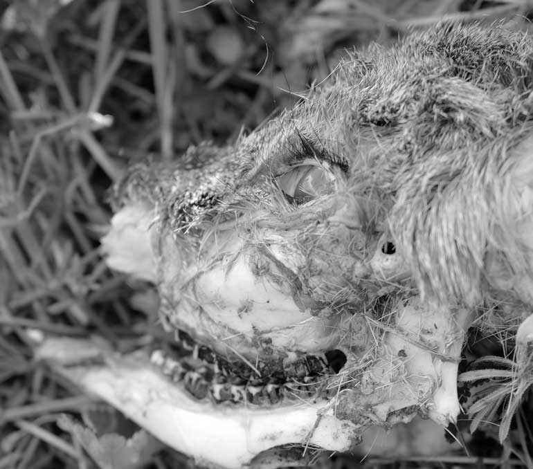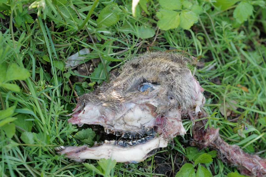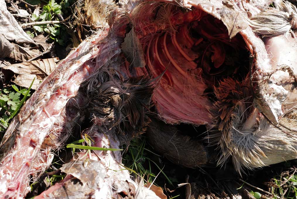abgenagt. Haut und Knochen. Fliegen noch gestern, dh Würmer sind nun keine mehr.