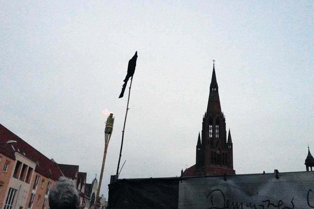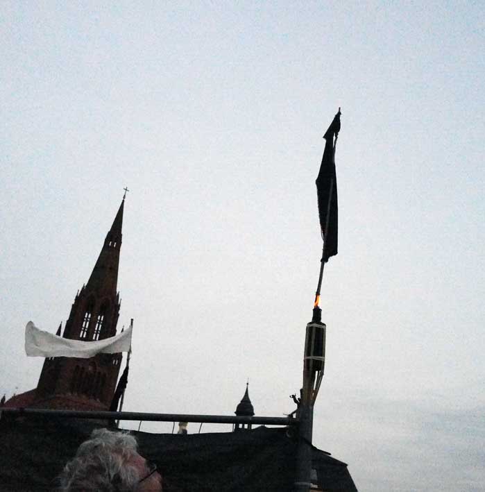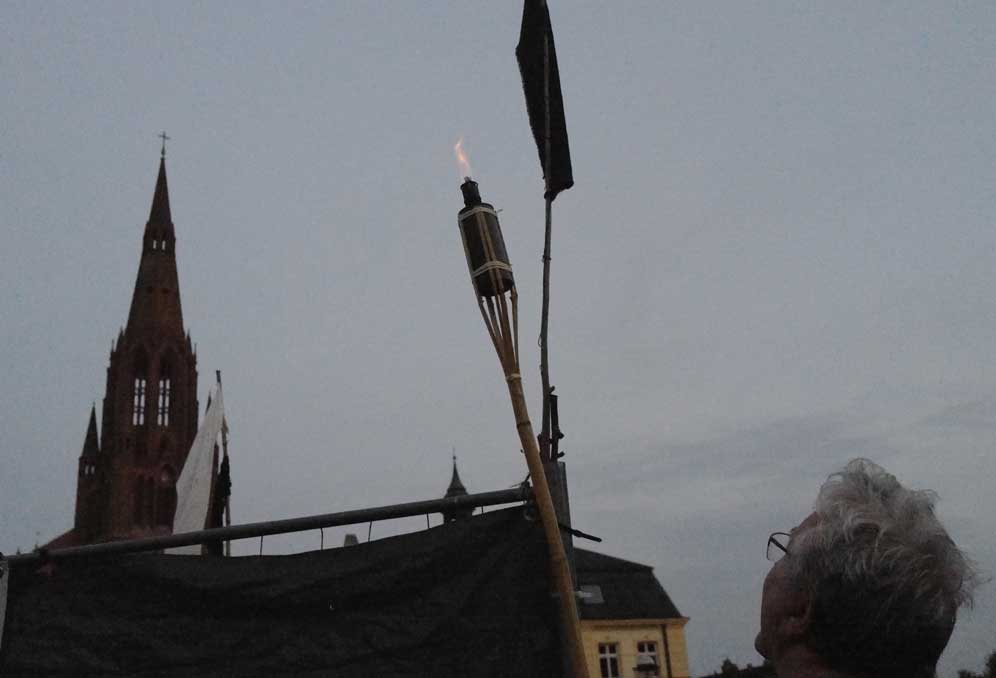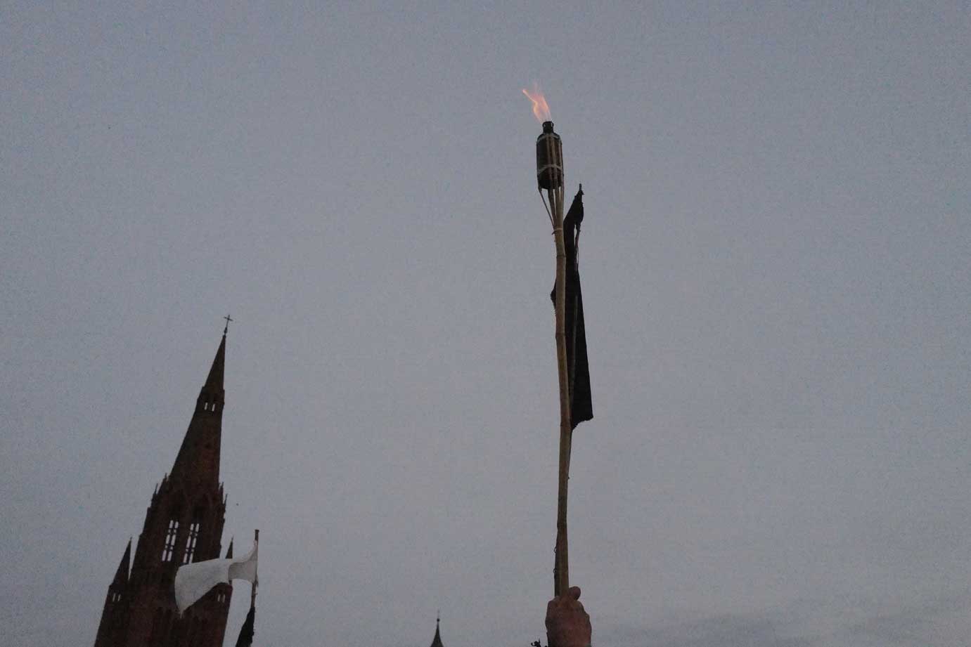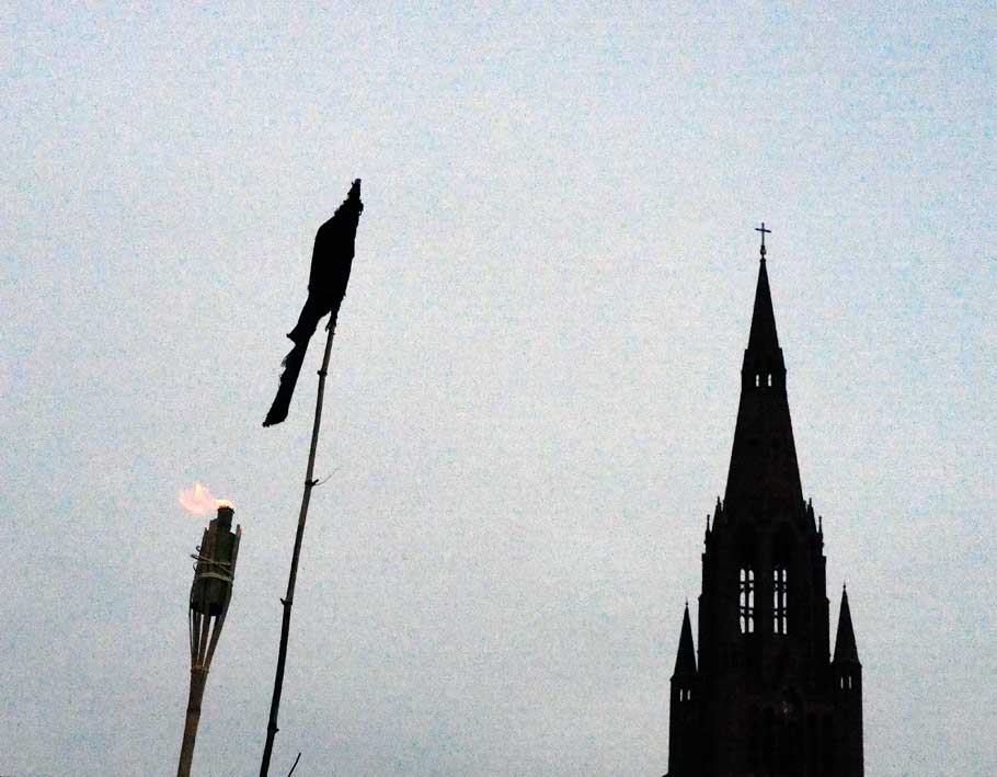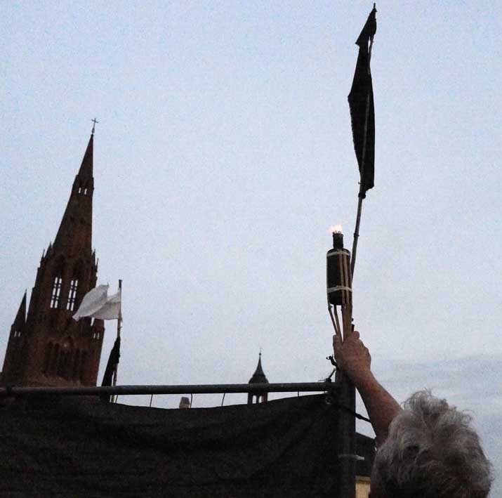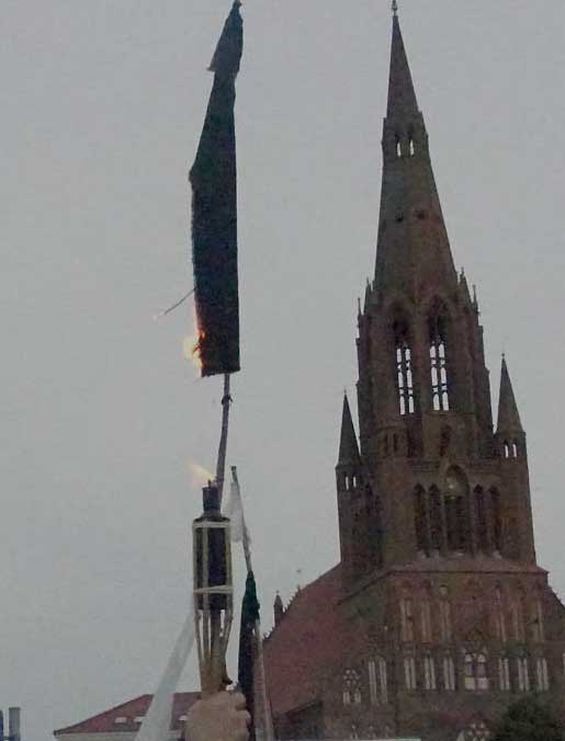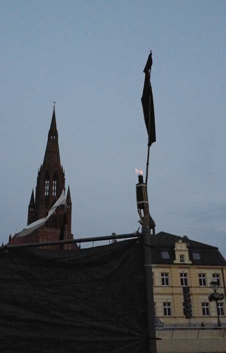vor der Kirche, die stehen blieb und mit den Fackln weiss und schwarz