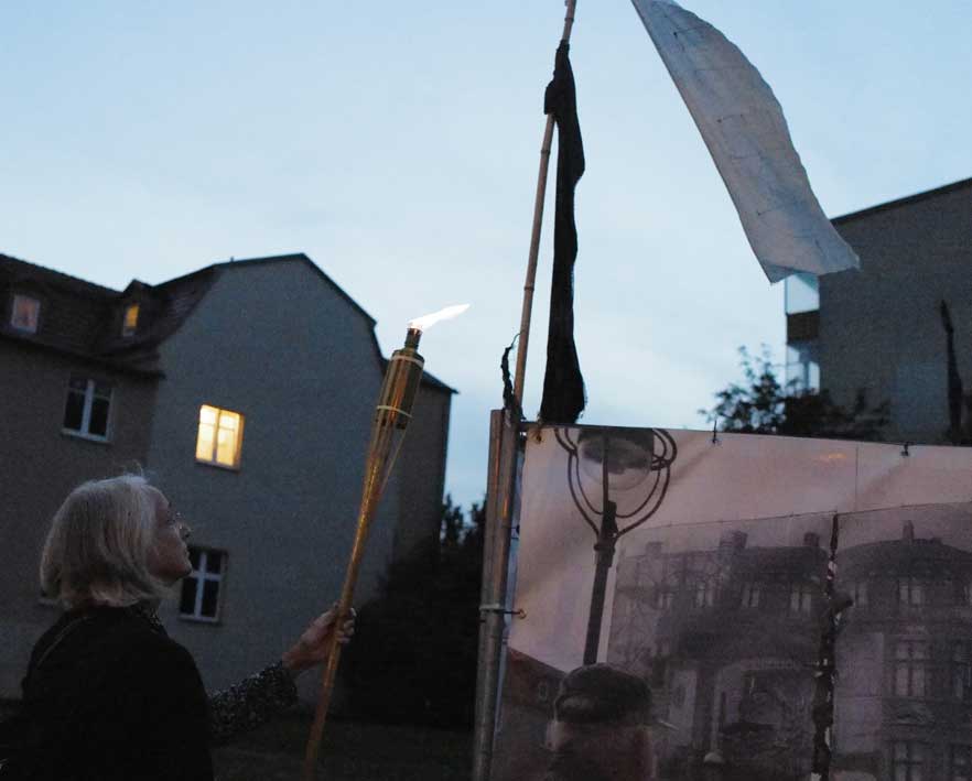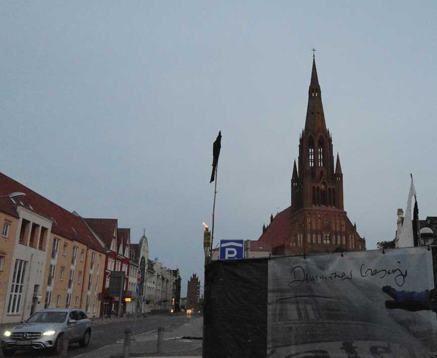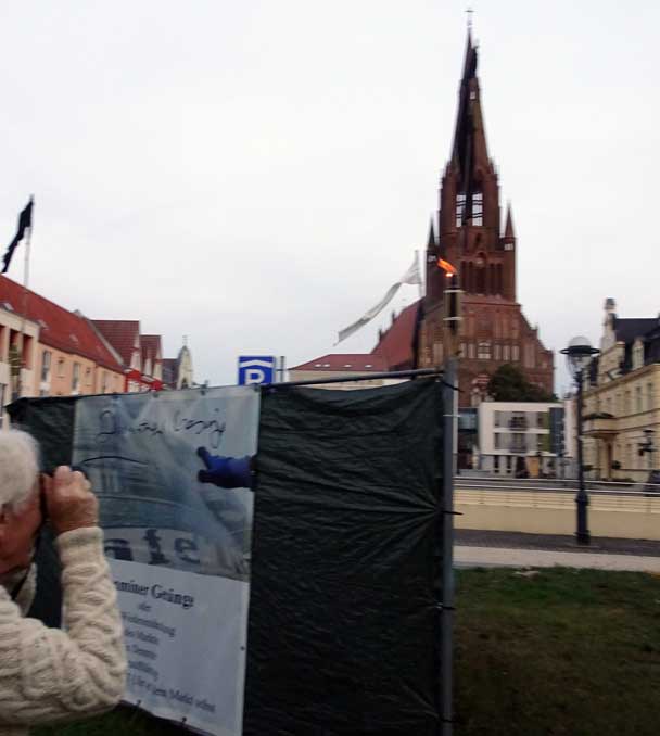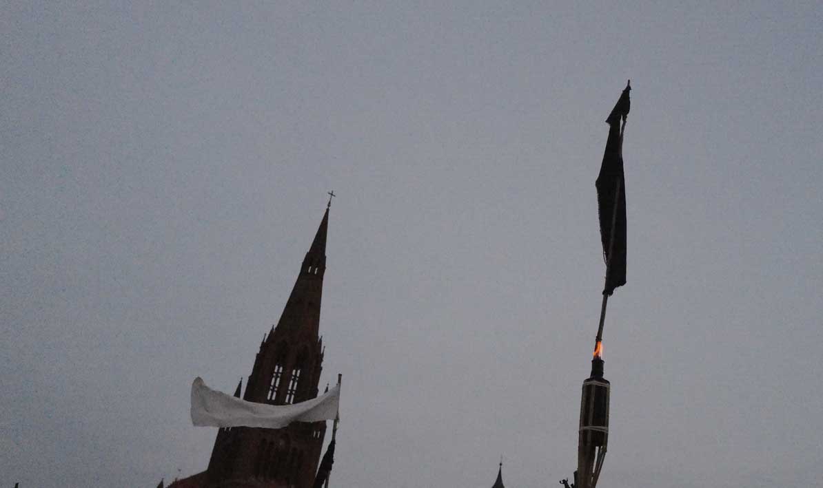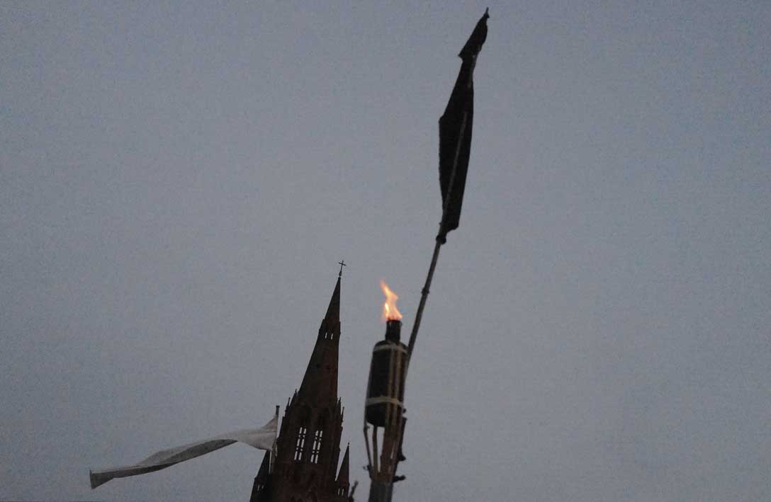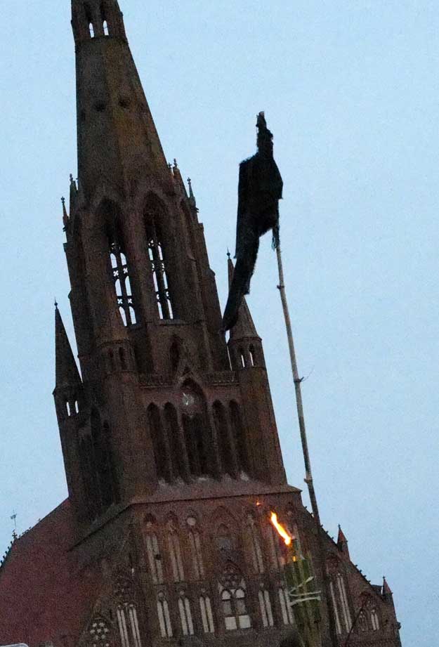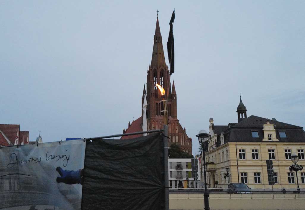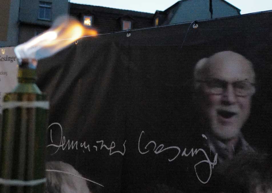 vor der Kirche, die stehen blieb und mit den Fackln weiss und schwarz