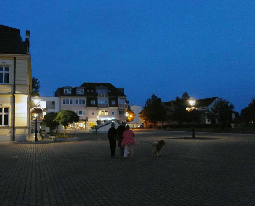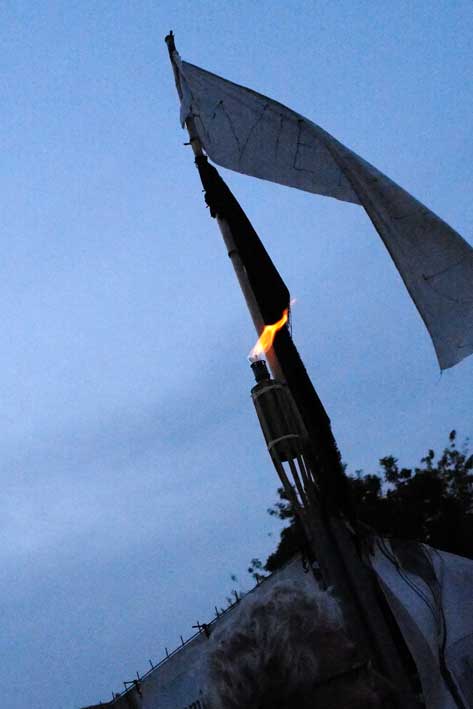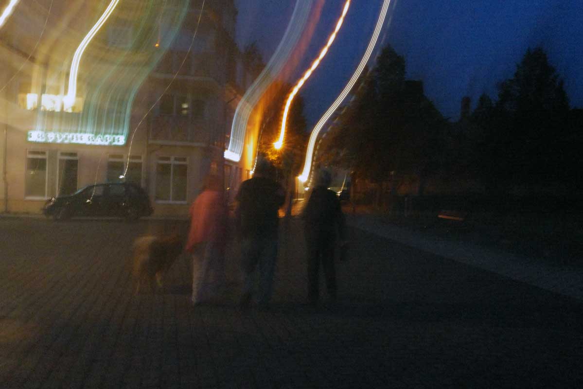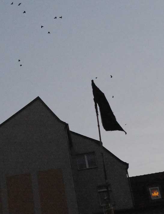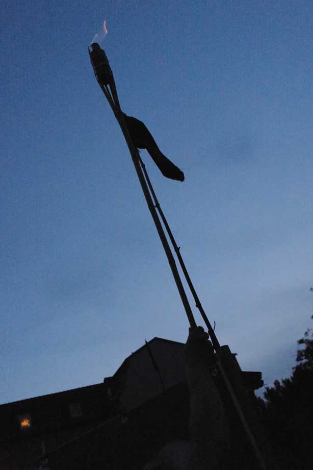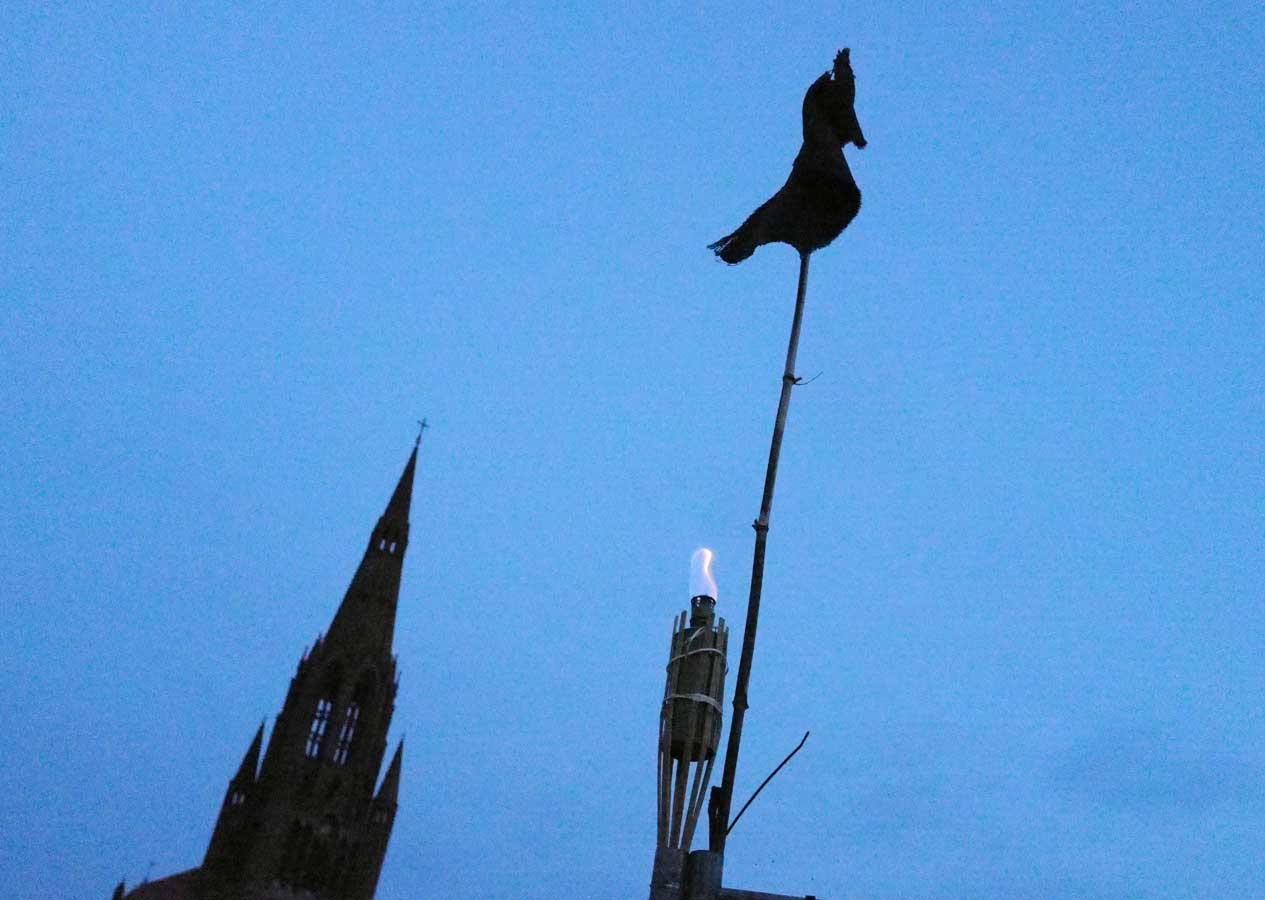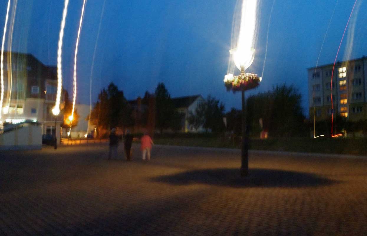 vor der Kirche, die stehen blieb und mit den Fackln weiss und schwarz