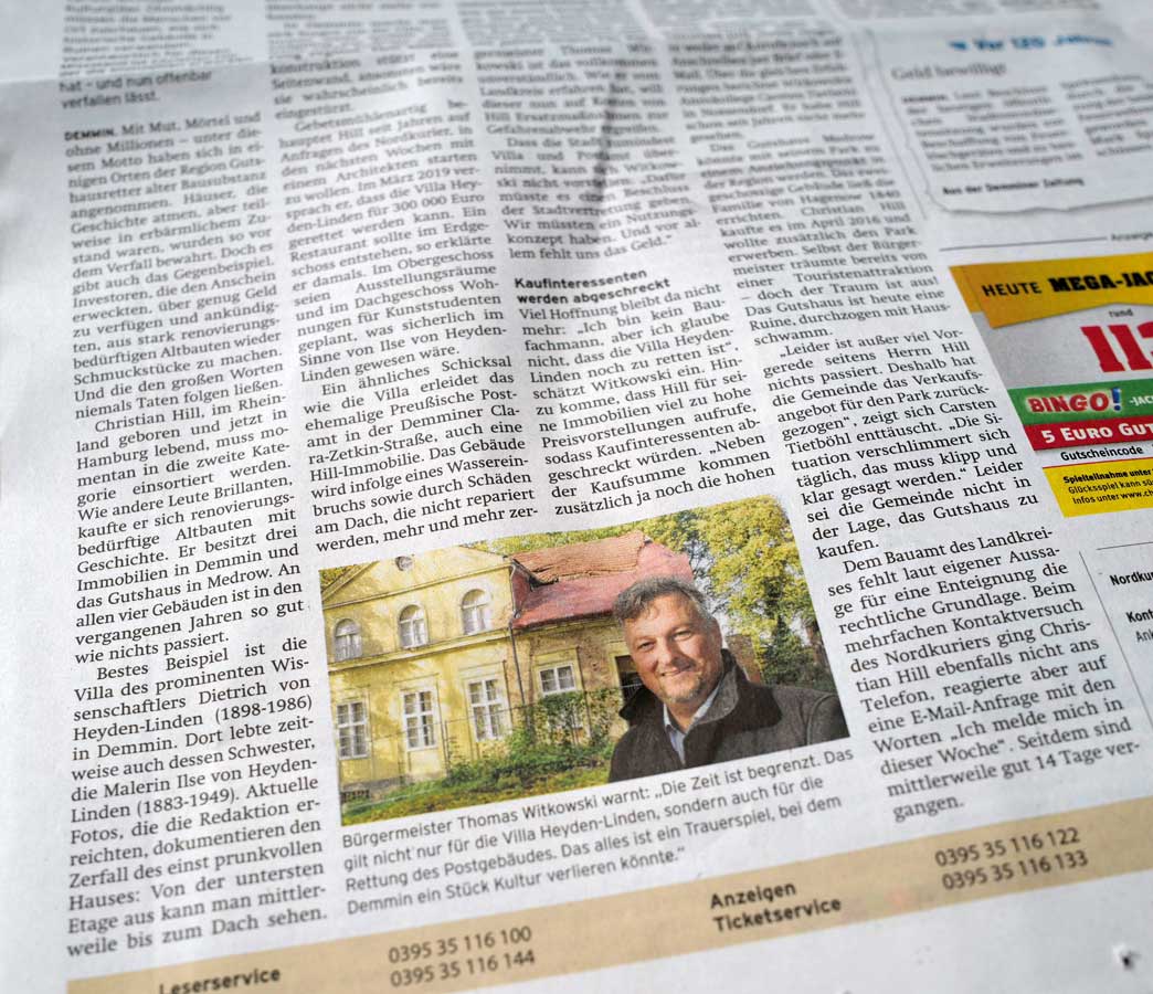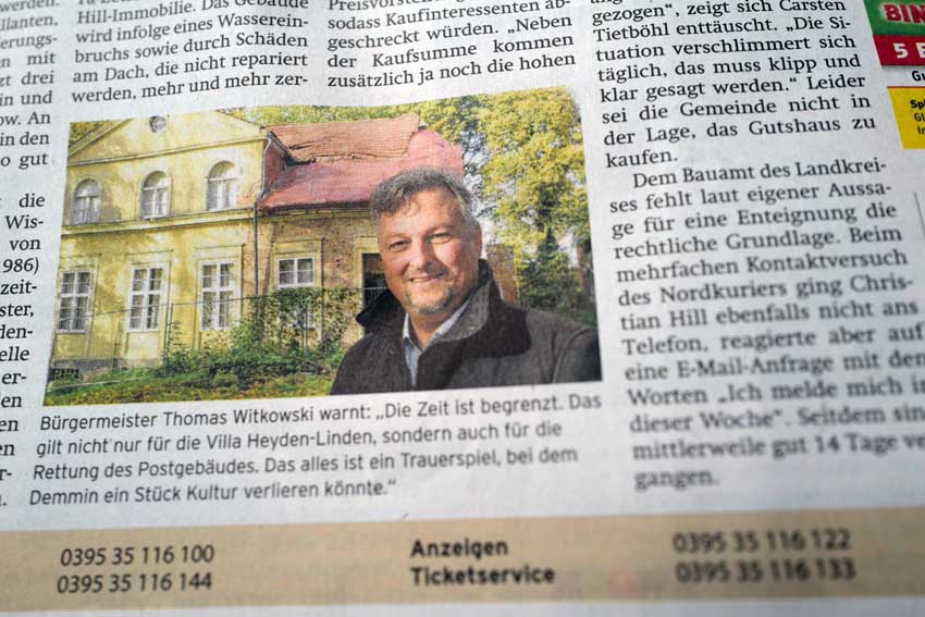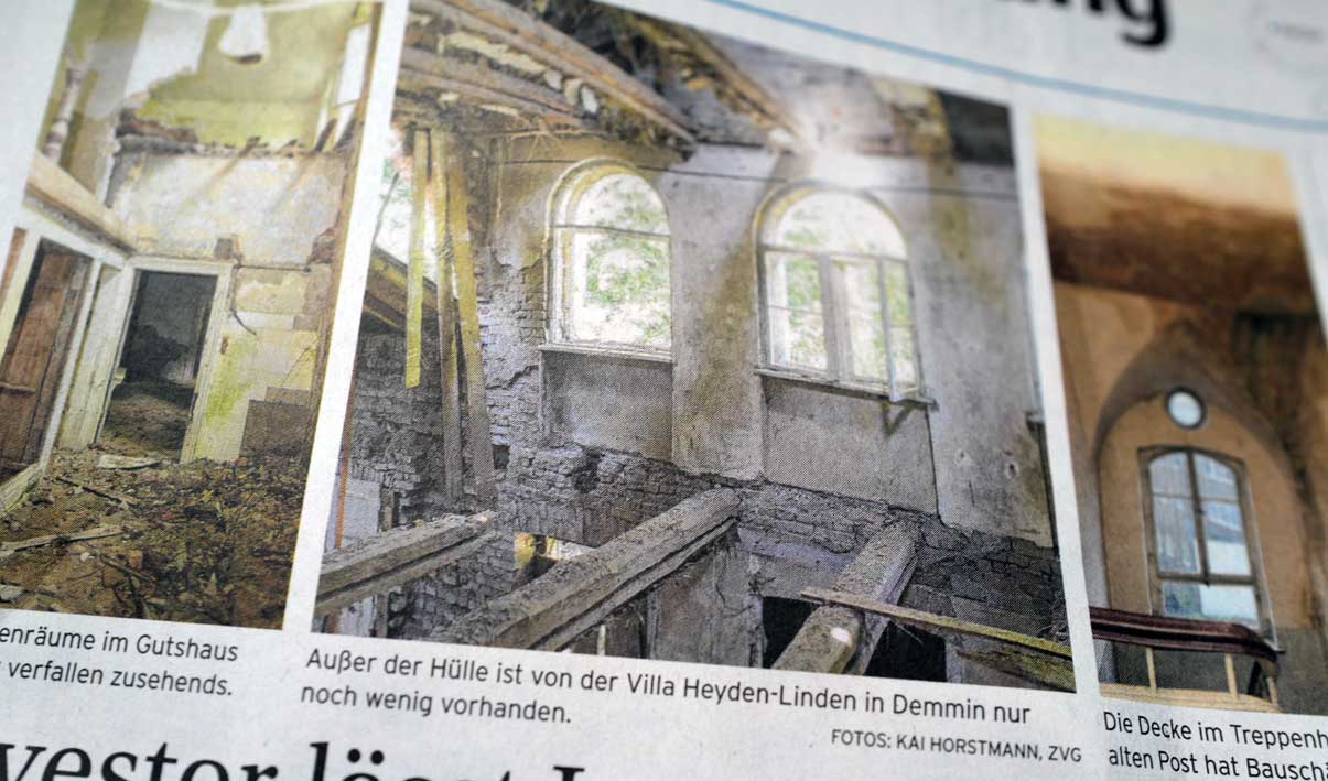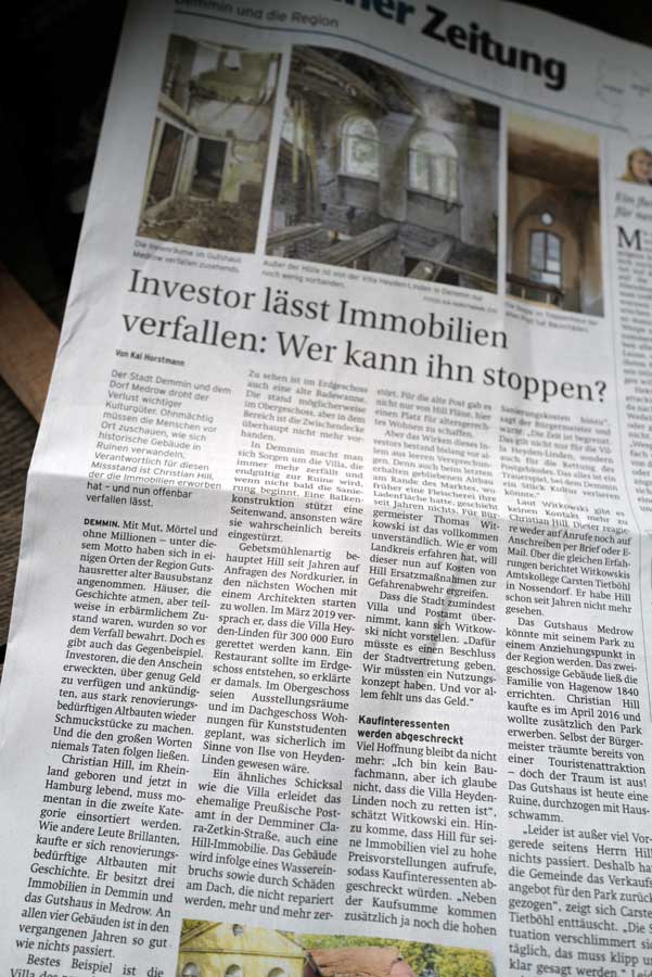 In Demmin, Haus Heyden Linden an allen Seiten abgegenagt der Park von der Stadt selbst, als ob er nicht dazugehörte. Kein gutes Beispiel guten Willens der öffentlichen Organe. In Medrow, der Park des Schlosses separat verkauft, in andere Hand gegeben, mit Vorkaufsrechten hoch getrieben, macht das Schloss selbst wertlos. Haus Demmin, das alte Flagschiff des Landes und der Stadt, verfallen vor aller Augen, ist nur wenigstens erhalten als Gedankenspiel, weil die Denkmalspflege alle Vernutzungskonzepte als banales Tourismus-Objekt bisher verhinderte.