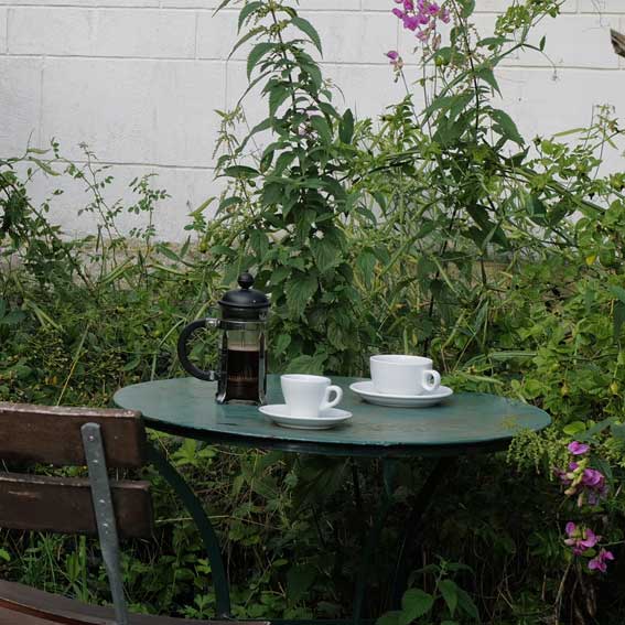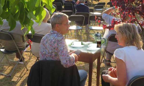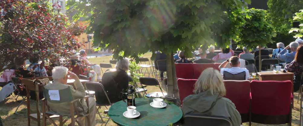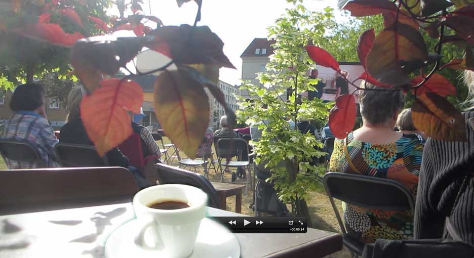 Ein Park-Cafe für alle, warum nicht sofort und durch zu gehen, sitzend und mit Spielen der Kinder daneben links und rechts.