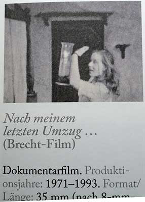 Der erste Film, der hier entstand, 1953 als Schüler aus Rostock bei Brecht im BE/Berlin auf 8mm und eigens angefertigter Kamera ohne eigenen Ton, war als eine geheime Dokumentation des Urfaust, im Aufrag Brechts selbst, gegen die offizielle Line der Partei im Osten. Später/1970 kommentiert und auf 35 aufgeblasen und als Nach meinem letzten Umzug bekannt. Nun ein besonders Dokument auf Film. 1970 mit einem aktuellen Statement zur Lage des Films in Deutschaland(nicht auf Zelluloid). Zum Beginn der eigenen Situation darin.