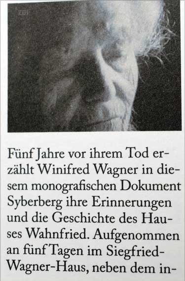 Nach dem Ludwigfilm (Requiem für einen jungfräulichen König)als sogen. Spielfilm, aus der Halle der Bavaria mit Richard Wagner-Musik, nun die Dokumentation mit Winifred Wagner in Bayreuth,