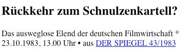Nach ersten Spielfilmen Scarabea /Wieviel Erde braucht der Mensch und San Domingo nach Kleist, der Dokumentarfilm über die Situation des Films damals im Deutschland des Schnulzen-Kartells und Heimatfilms im Kinos, auf 16 mm mit Bild und Ton parallel mit bewegter Kamera in langen Einstellungen, und kurzer Zeit aufgenommen. Einfach, transparent und kämperisch als Kontrast in Sinn und Tcchnik. Schwierige Position im FS als Kopartner mit der noch aktuellen Filmindustrie der Zeit.