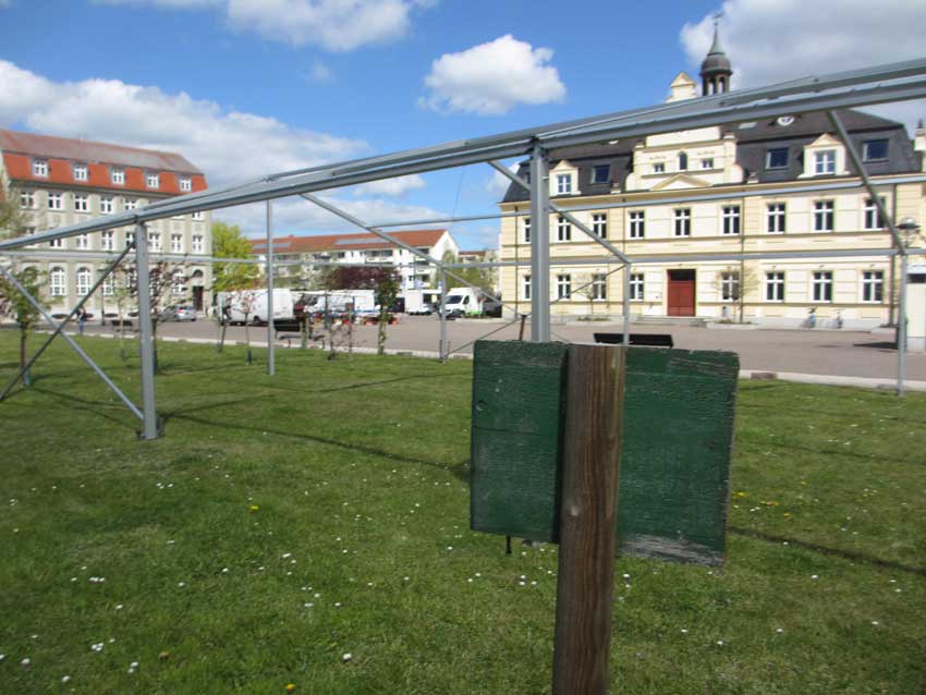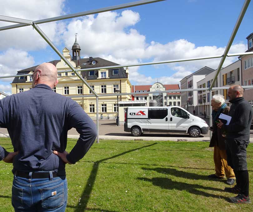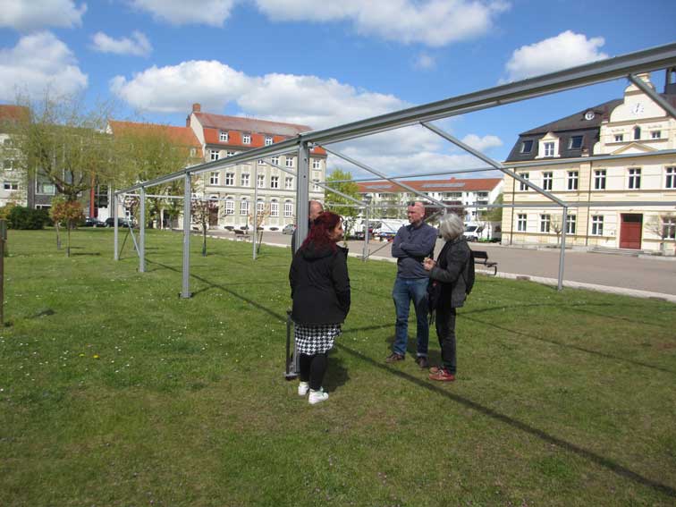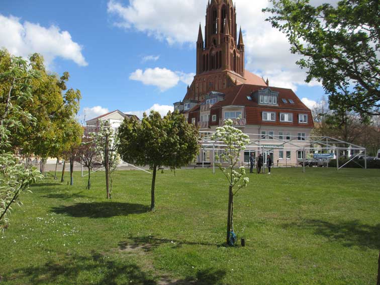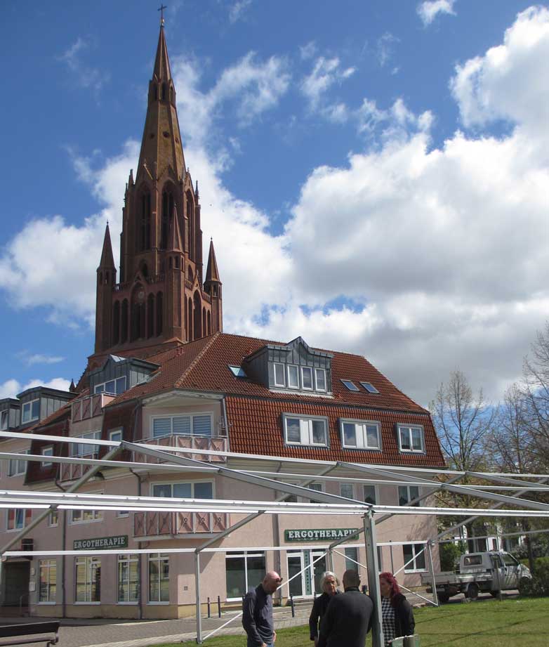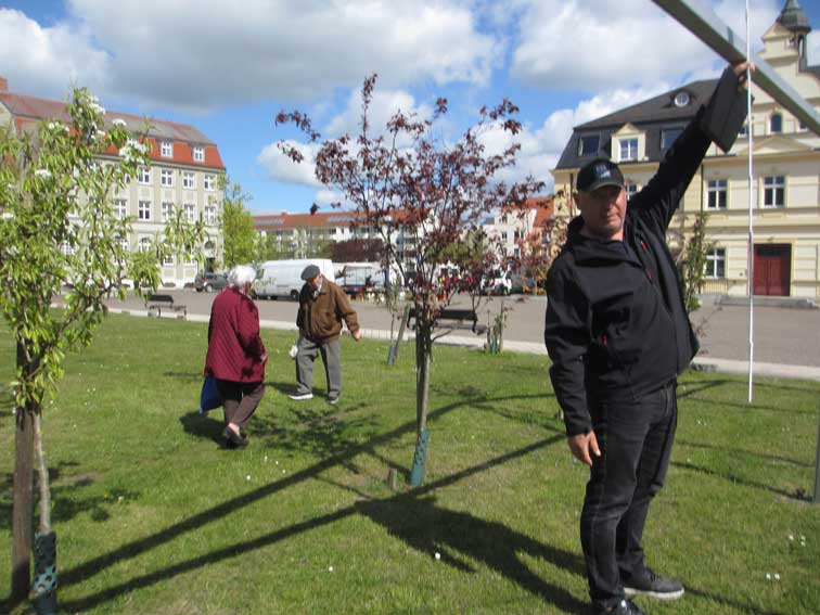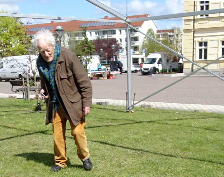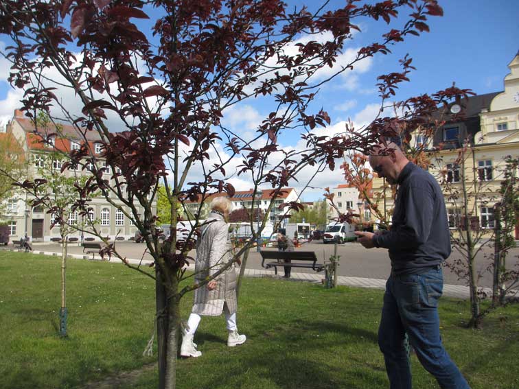 Auf dem Markt von Demmin. Eben kam die Bewohnerin der Häuser rundum mit ausgebreiteten Armen, ja so gehen durch die Bäume dort
