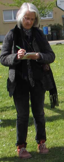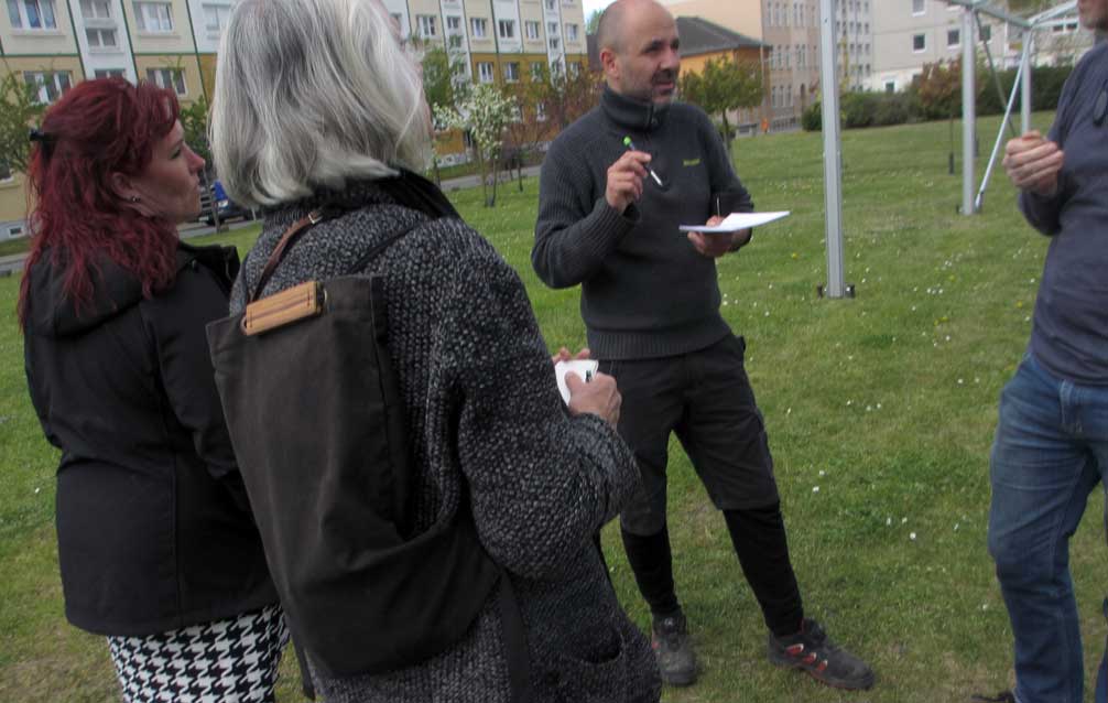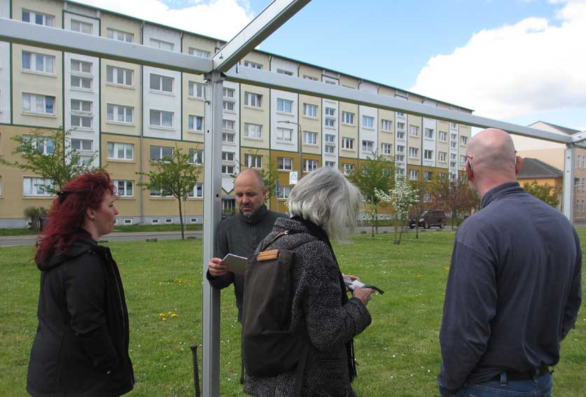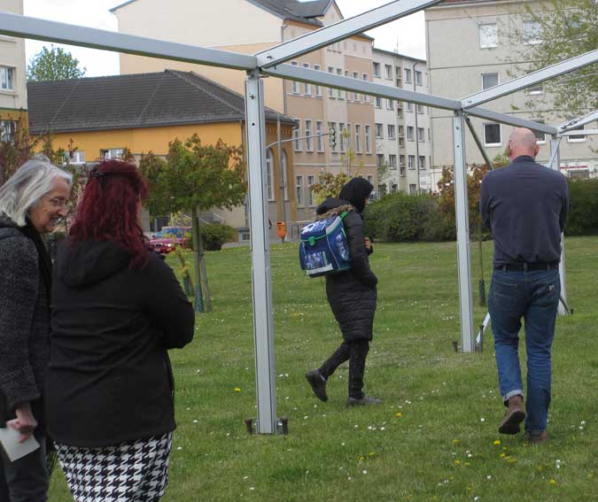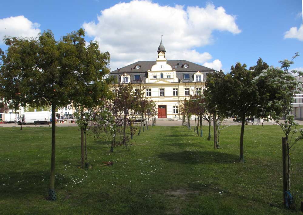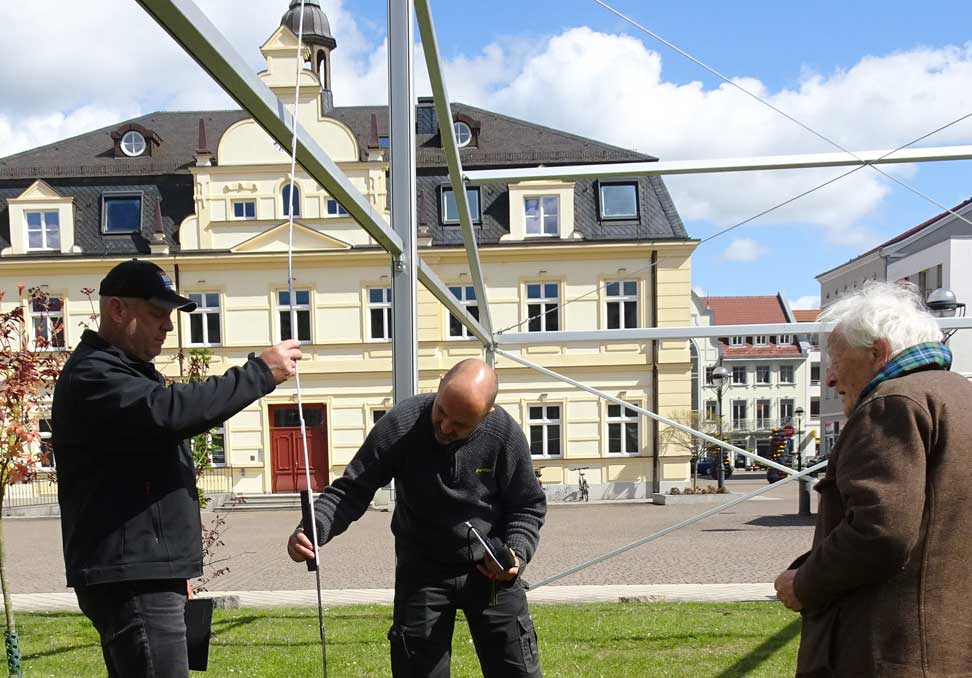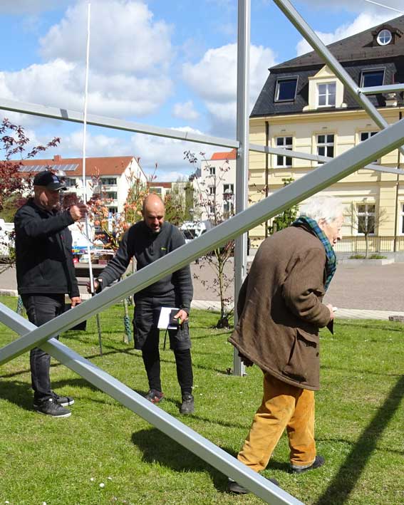 Auf dem Markt von Demmin. Eben kam die Bewohnerin der Häuser rundum mit ausgebreiteten Armen, ja so gehen durch die Bäume dort