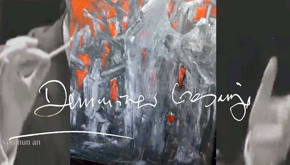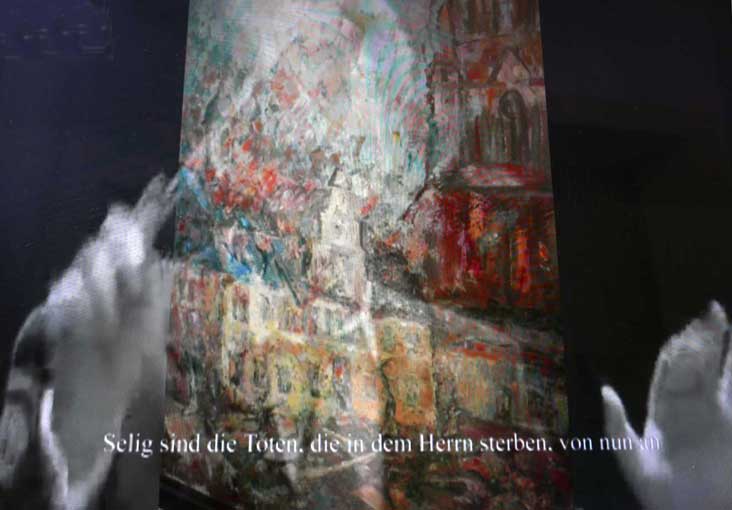 Das brennende Demmin, gemalt vom alten K. Schlösser kurz vor seinem Tode, die Kindheit erinnernd.