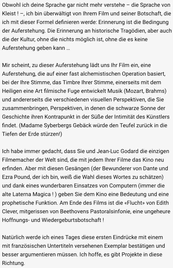 Although no longer understanding your language at all – the language of Kleist ! –, I am overwhelmed by your film and by its message which I will define by this formula: memory is the condition of resurrection. The memory of historical tragedies, but also that of culture without which nothing is possible, without which no resurrection can happen…
