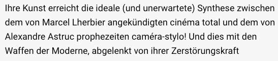 PS.Your art achieves the ideal (and unexpected) synthesis between the cinéma total announced by Marcel Lherbier and the caméra-stylo prophesied by Alexandre Astruc ! And this with the weapons of modernity diverted from their destructive