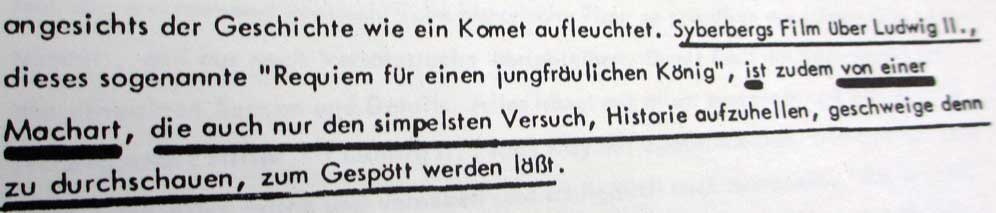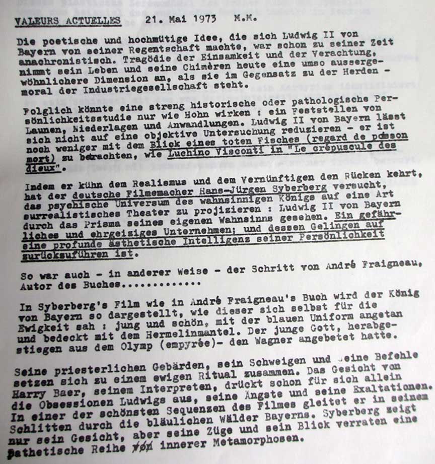 Aktuell ein Film aus Deutschland 2023 mit auch einer Kritik aus Frankreich gestern hier zu lesen, aus derselben Hand, die auch in Paris 1973, also vor 50 Jahren über den Ludwig II in einem Film aus diesem Deutschland geschrieben hatte wie lange nicht über einen Film von hier :