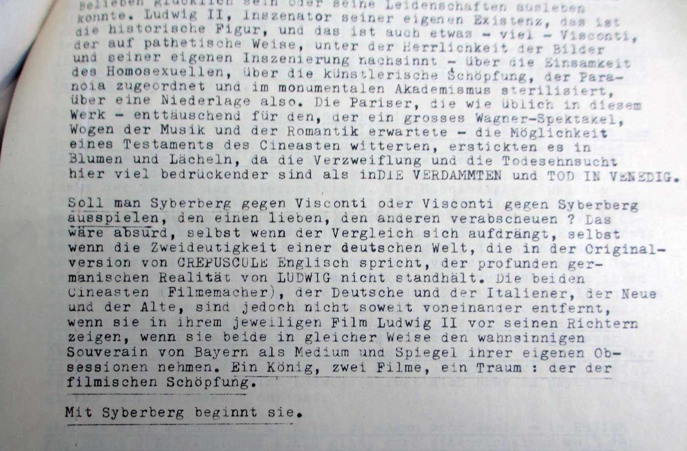 Aber nicht nur dieser Film zu diesem letzten Volkskönig-Ludwig II aus Bayern, sondern auch das Meisterstück des alten Visconti war in Paris vor 50 Jahren zu vergleichen. Immer dann, wenn es um die Gefühle der Menschen ging, diese Waagschale des richtigen Tons. In Farben wie Formen überhaupt, mit damals Richard Wagner im Spiel. Und dann das, was in den Zeitungen dazu stand als Urteilspruch der Zeit, sich zu behaupten oder zentral zu verlieren. Hier und damals in Frankreich - wie heute.