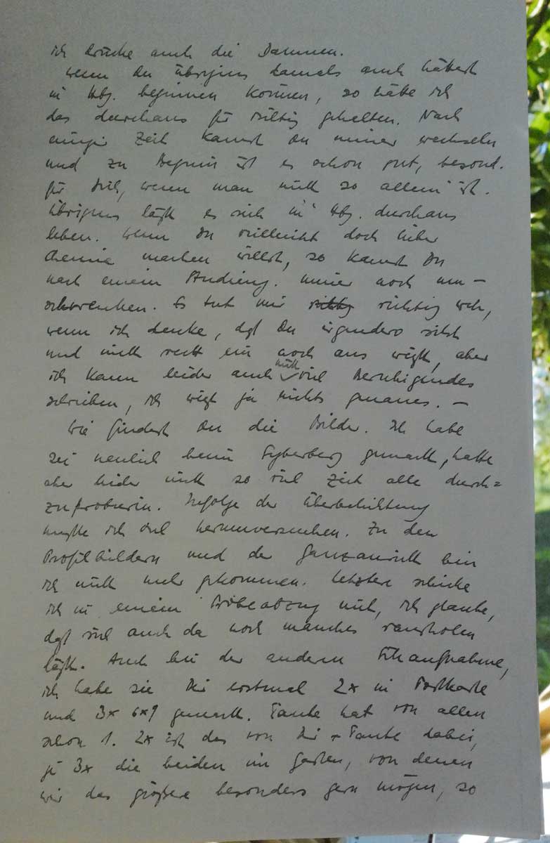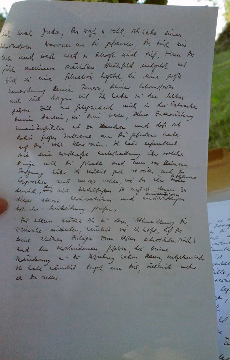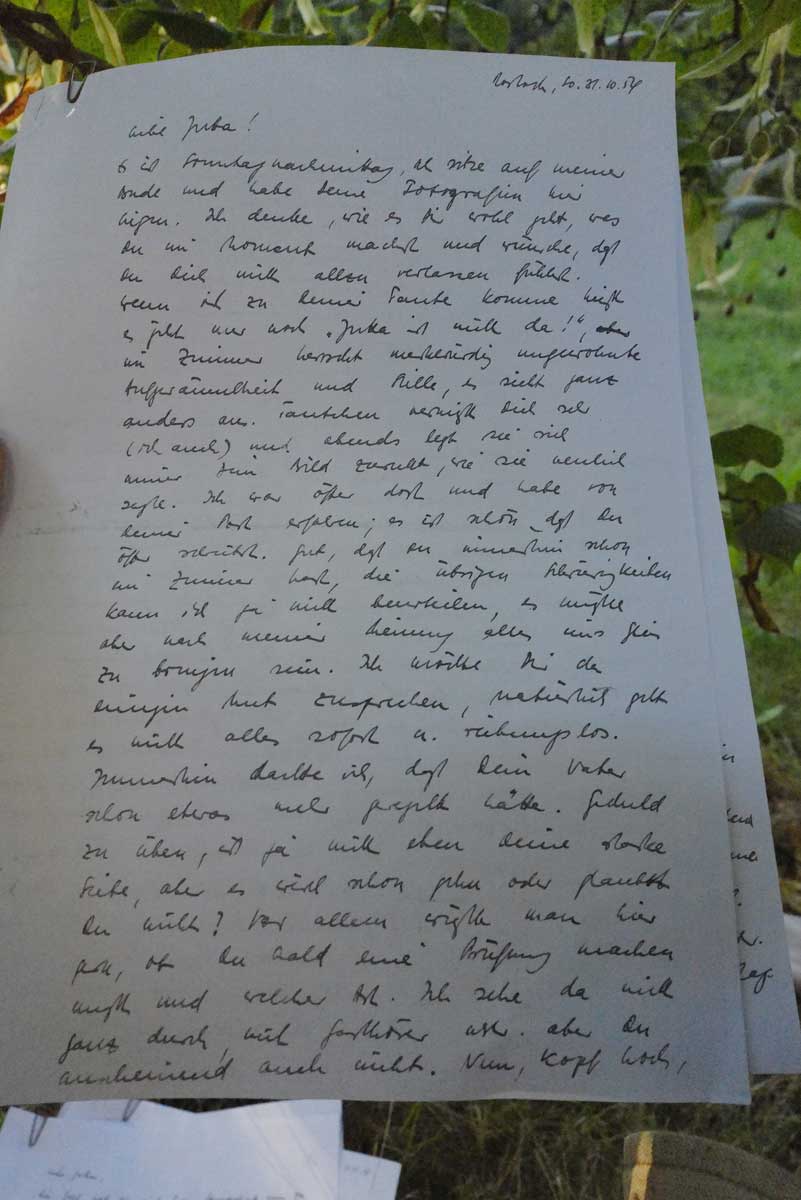 "Sieh mal Jutta, Du weisstes wohl,ich habe einen besonderen Narren an Dir gefressen, Du bist mir lieb und wert...."und es folgen viele Hinweise auf das was auch dort rettete. Und Empfehlungen in den Westen so zu tun. Botschaften, wie damals erkannt. Sich entwicklend . Aufreibend, sich enthäutend, immer bis auf den Kern. Hinauf und hinein.