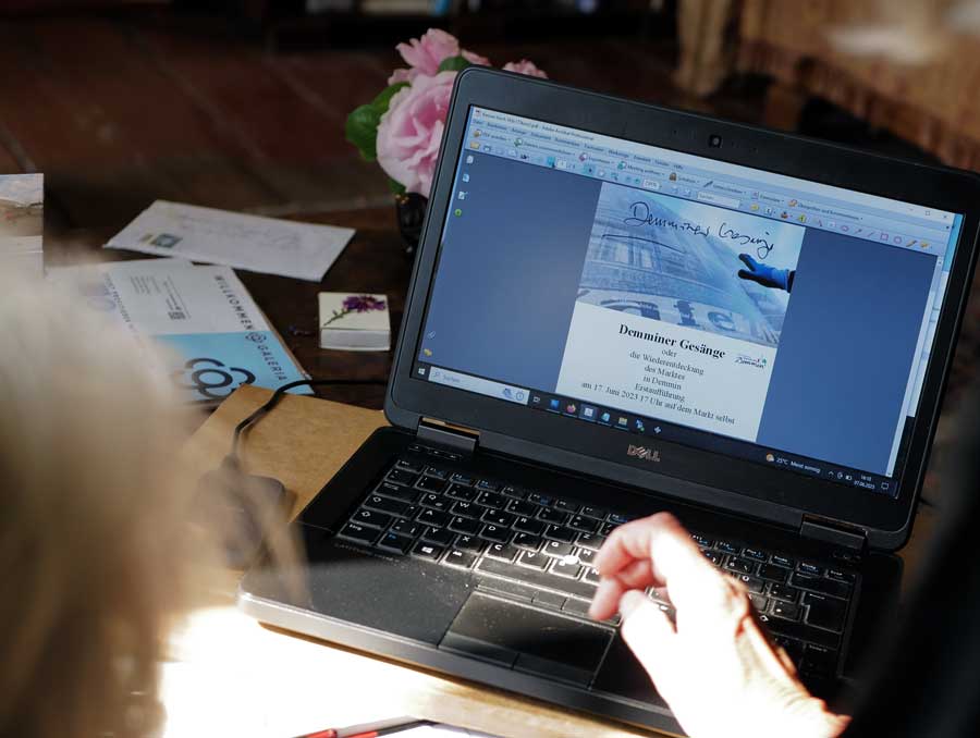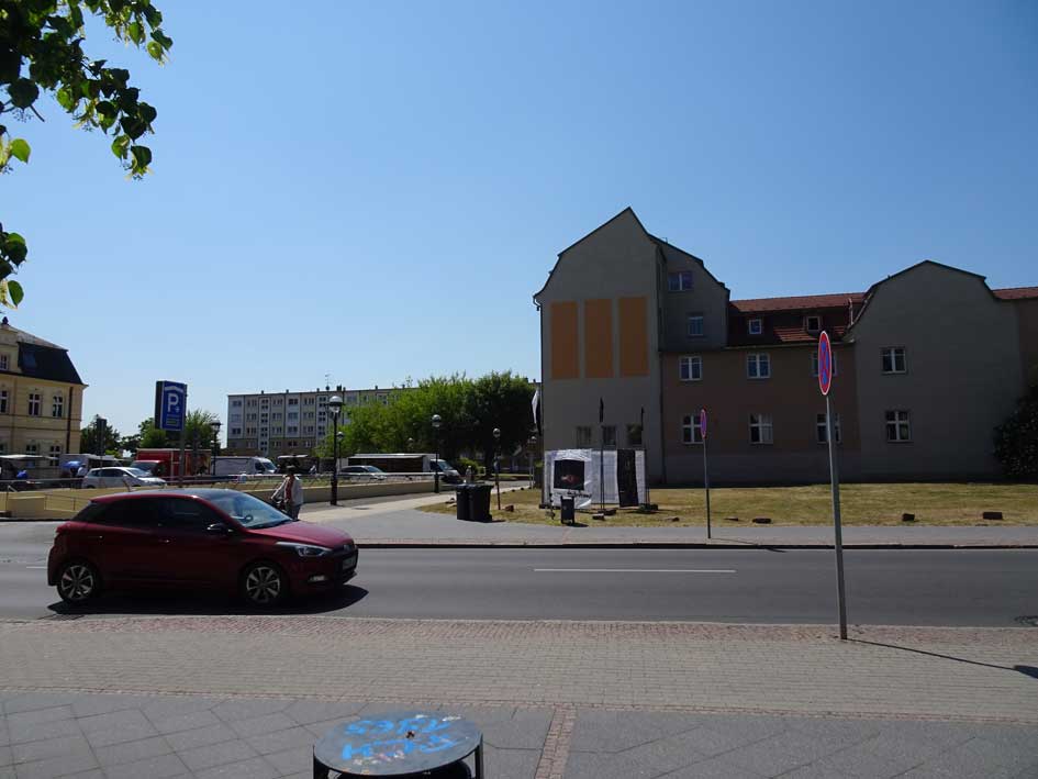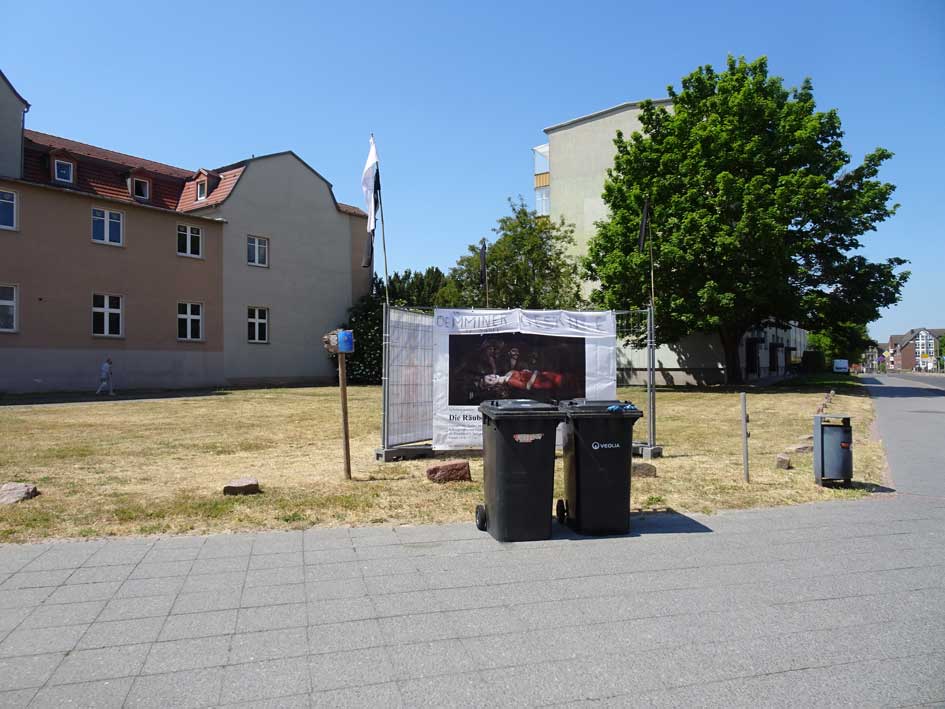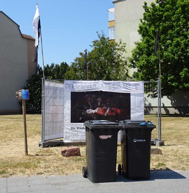 der Film zur Wiederentdeckung des Marktes, wie er seit 2015 entstand mit den Plakaten zu den Räubern als Gastspiel aus Berlin auf der Südseite des Marktes 2018 jetzt auch im Film und blaues Schild mit einer finanziellen Beteiligung vom Pom. Fond des Landes aus Schwerin.