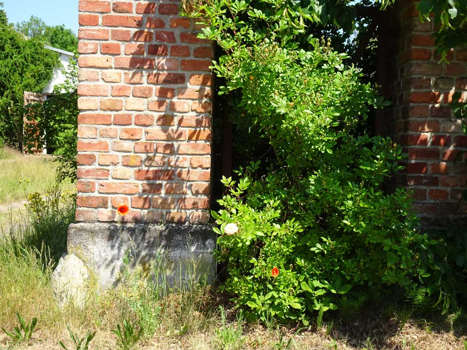 Seit 2001 wieder entstandene Pfeiler am Tor zu Haus und ehem. Hof. Gemauert aus dem Dorf der Nachbarn.