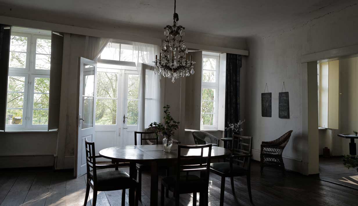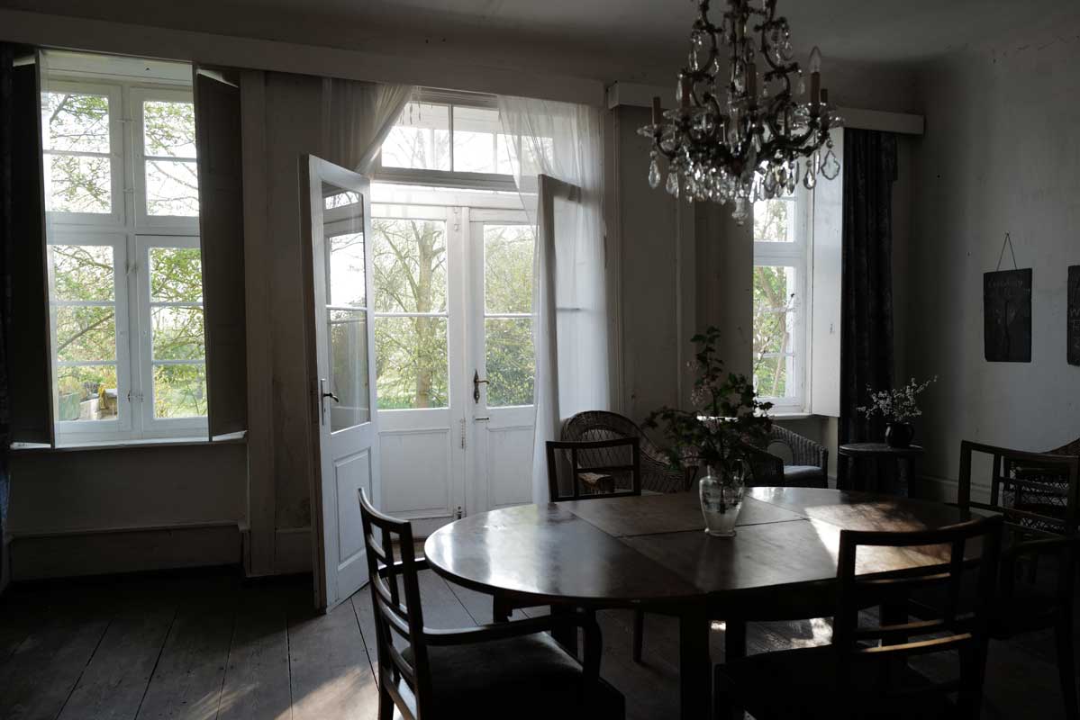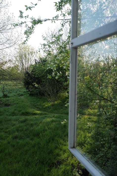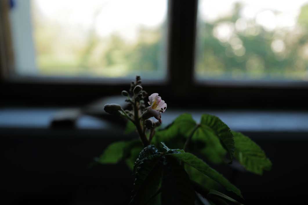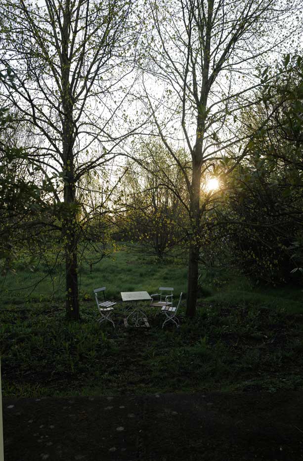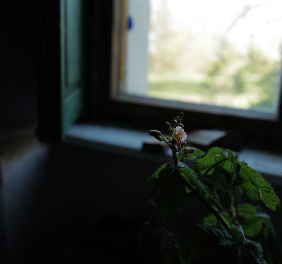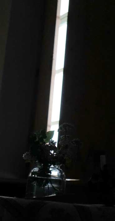 Eben noch vom Sturm und der fallenden Ulme gebrochen und nun aus der Kälte geborgen, geht sie auf, die Kastanie, drausen die Schwestern am Baum noch weit zurück,