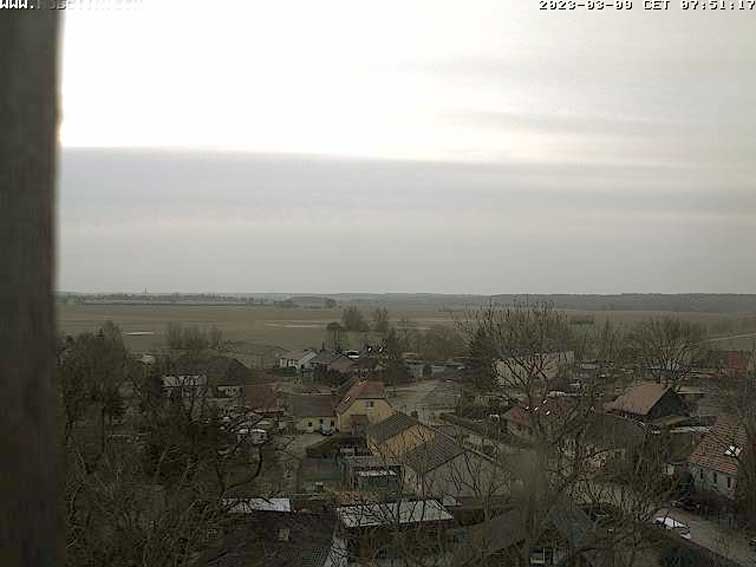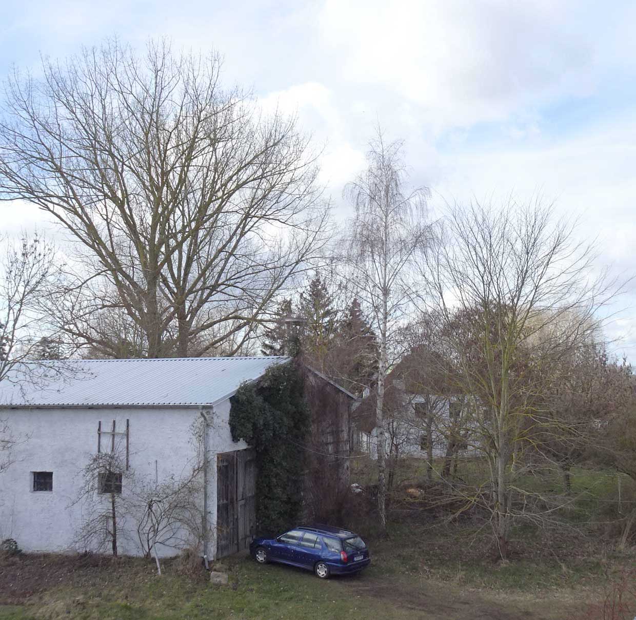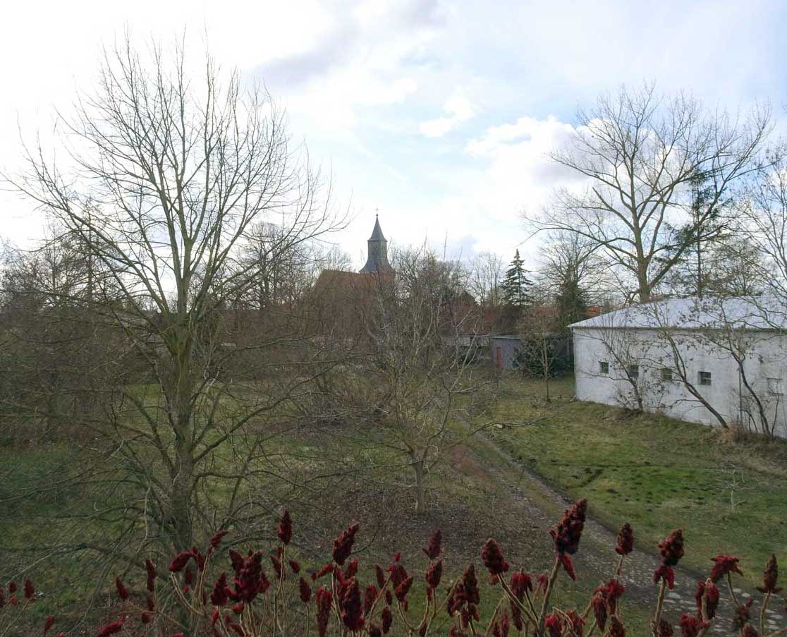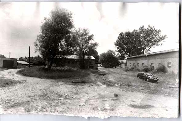 Nach vorne Richtung die Kirche ohne Turm, quer im Hof der Konsum links Garagen an der Stelle des Kuhstalls.