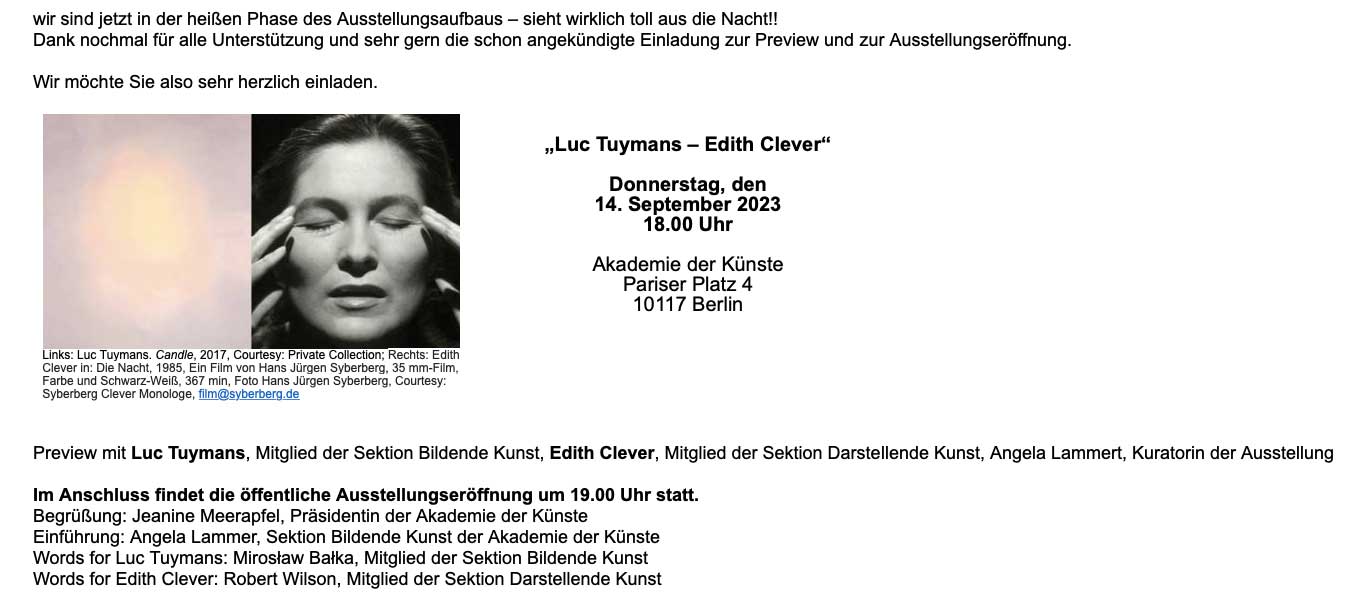 Robert Wilson der Bruder auf den Bühnen von Anfang an in Paris aus des Ludwig Zeiten, ist angekündigt mit Words for Edith Clever (akademisch laudatio), aber wie das mit Brüdern ist, nur teilweise aus Kenntnis des Ganzen, inklusive der gestrichenen Teile, aus denen das Ganze dann gewachsen ist, ob hier inklusive auch der grossen Prädudien mit der Rede der eigentlichen Bewohner Amerikas vor dem Präsidenten der Vereinigten Staaten von Amerika heute, sehr nahe, in Zeiten der Kolonialdebatten,wenn man sie ernstnimmt. Wir wollten es nicht verschweigen.