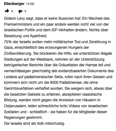 Wie bequem es ist, von der Grausamkeit der Hamas schockiert zu sein, ihre Handlungen der ganzen Welt zu präsentieren und ihr Volk Monster zu nennen. Nichts davon gibt Israel das Recht, ähnlich zu handeln. Als ich vor einigen Monaten in einem Interview sagte, dass Israels Behandlung palästinensischer Gefangener nicht besser ist als die Behandlung der Hamas mit uns, und vielleicht sogar noch schlimmer, wurde ich vom ersten und aufgeklärten Programm für aktuelle Angelegenheiten im israelischen Fernsehen angeprangert und gefeuert. Nach Shezafs Bericht ist das Bild noch deutlicher: Wir sind wie die Hamas geworden.