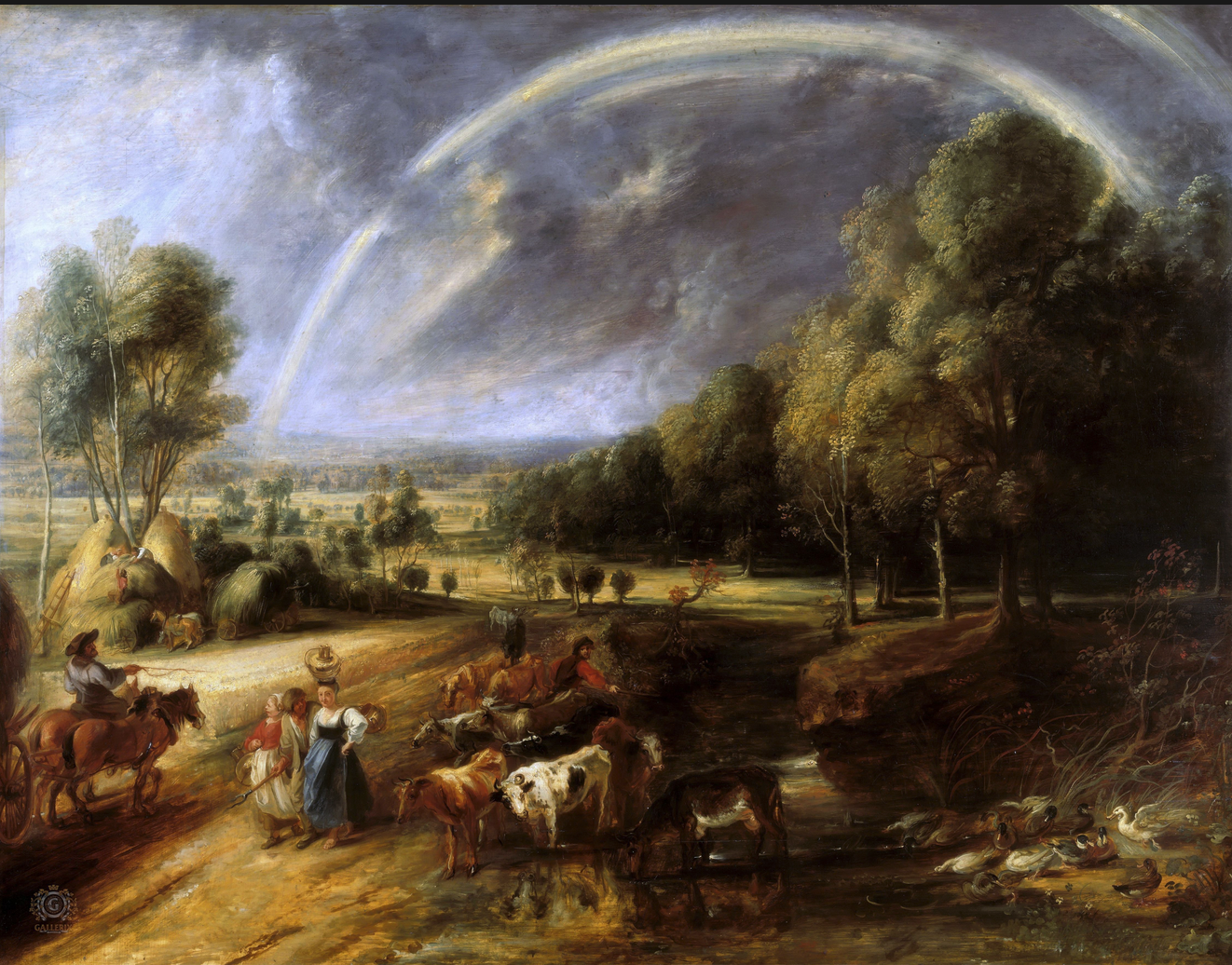 Wir kennen das Bild der Heuernte mit Regenbogen aus München. Inzwischen in den Keller verbannt, ins Depot, wegen angeblicher Werkstattmitarbeit.-Herstell. des Gartens nun auch mit vielen Werkstattbildern.