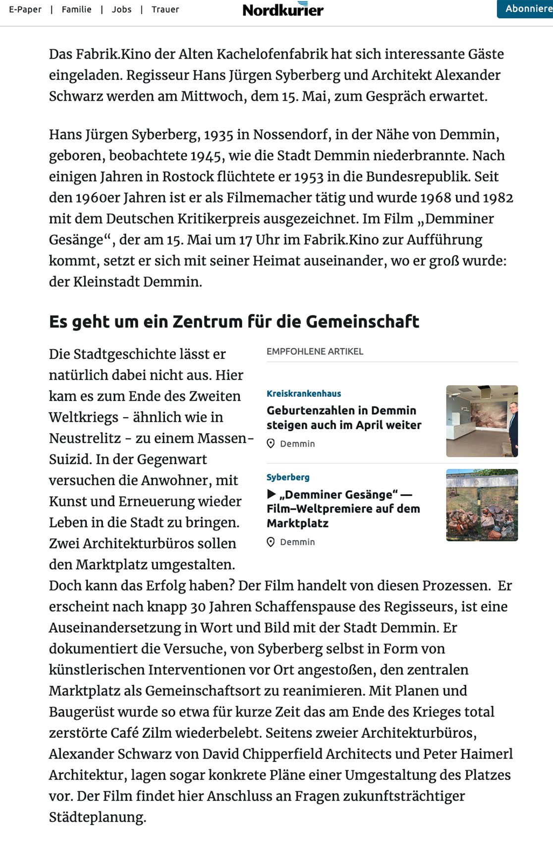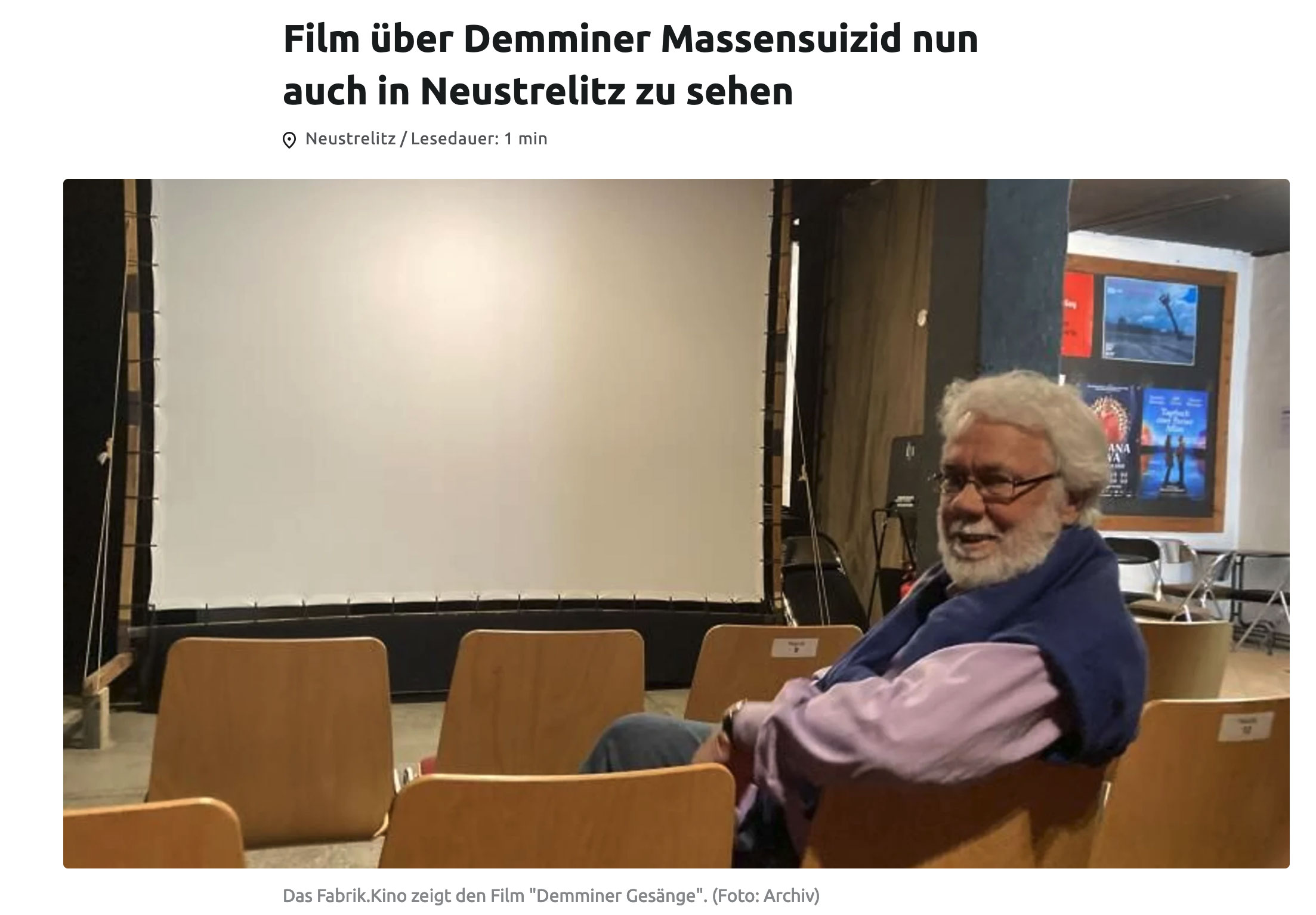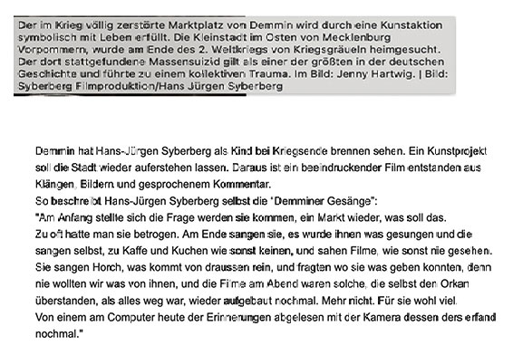 eben noch dies"DIE NACHT "one of the most extraordinary memories of my life" oder "a film that remains in memory one of the most astounding and resonant works of modern cinema" alles aus einem dunklen Raum viele Stunden nur eine Stimme und mit Bewegungen wie zur unendlichem Melodie so immer fort und dann dies andere Panoroma jetzt einer Post-DDR Realität zu einem krächzenden Harmonium, nur manchmal unterbrochen durch andere Einbschübe in Bild und Ton. In einem Ort abseits ohne Interesse, wenn nicht durch ein böses Schicksal schon fast 80 Jahre her.