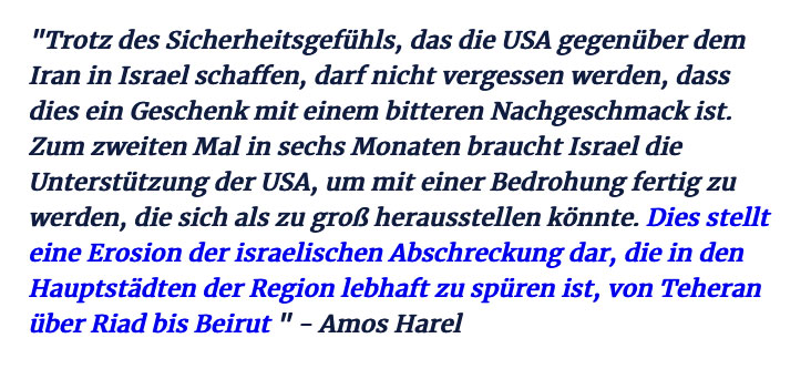 Warum hat Israel das zuglassen, gewollt. Man sollte Israel in jetziger Formation nicht absichern so zu handeln. Nicht nur Waffen sind gefährlich. Und nicht alle Juden sind nett. Auch Israel hat seine AfD. Demokratisch erwählt. Solange wir mitmachten gings uns gut, alle Taschen voll, nun sind die Strassen auch den USA anders besetzt, und Erwünschtes von dort gestaltet sich neu. Denn so nimmt das Unheil seinen Lauf. Weltamsstab im Visier. Besinnen was unsere Aufgaben wären. Sicher nicht dort mitzutun. Nicht mit Waffen und Geld und Worten.