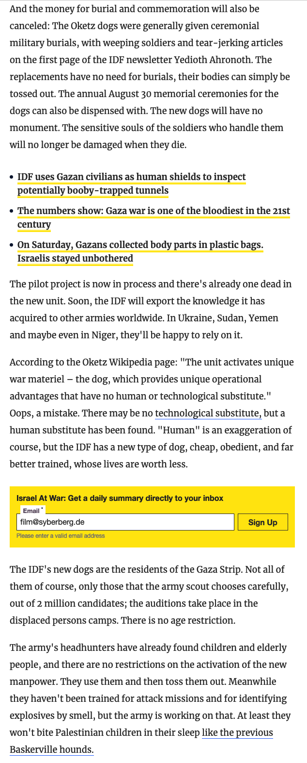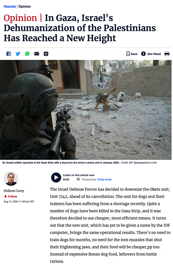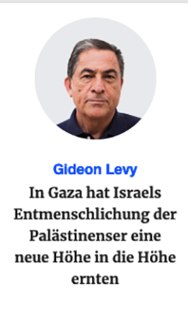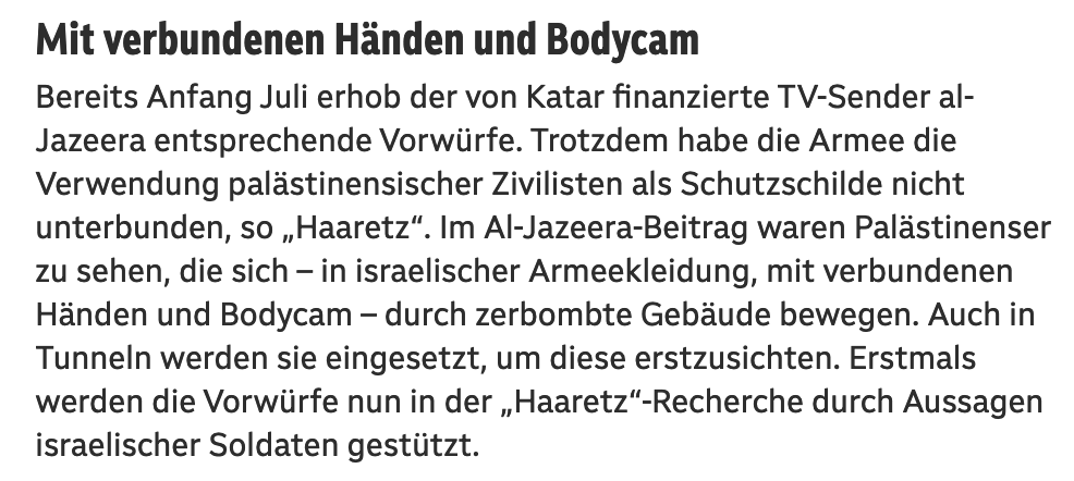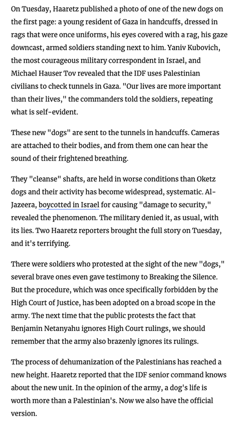 Am Dienstag veröffentlichte Haaretz ein Foto von einem der neuen Hunde auf der ersten Seite: ein junger Bewohner von Gaza in Handschellen, in Lumpen gekleidet, die einst Uniformen waren, seine Augen mit einem Lappen bedeckt, sein Blick niedergeworfen, bewaffnete Soldaten, die neben ihm standen. Yaniv Kubovich, der mutigste Militärkorrespondent Israels, und Michael Hauser Tov enthüllten, dass die IDF palästinensische Zivilisten einsetzt, um Tunnel in Gaza zu überprüfen. "Unser Leben ist wichtiger als ihr Leben", sagten die Kommandeure den Soldaten und wiederholten, was selbstverständlich ist.