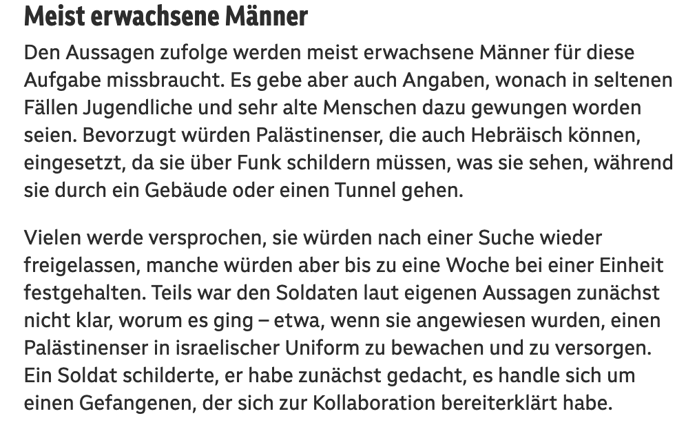 Sie "reinigen" Schächte, werden unter schlechteren Bedingungen gehalten als Oketz-Hunde und ihre Aktivität hat sich weit verbreitet, systematisch. Al-Jazeera, der in Israel wegen "Schädigung der Sicherheit" boykottiert wurde, enthüllte das Phänomen. Das Militär leugnete es, wie üblich, mit seinen Lügen. Zwei Haaretz-Reporter brachten die ganze Geschichte am Dienstag, und es ist erschreckend.