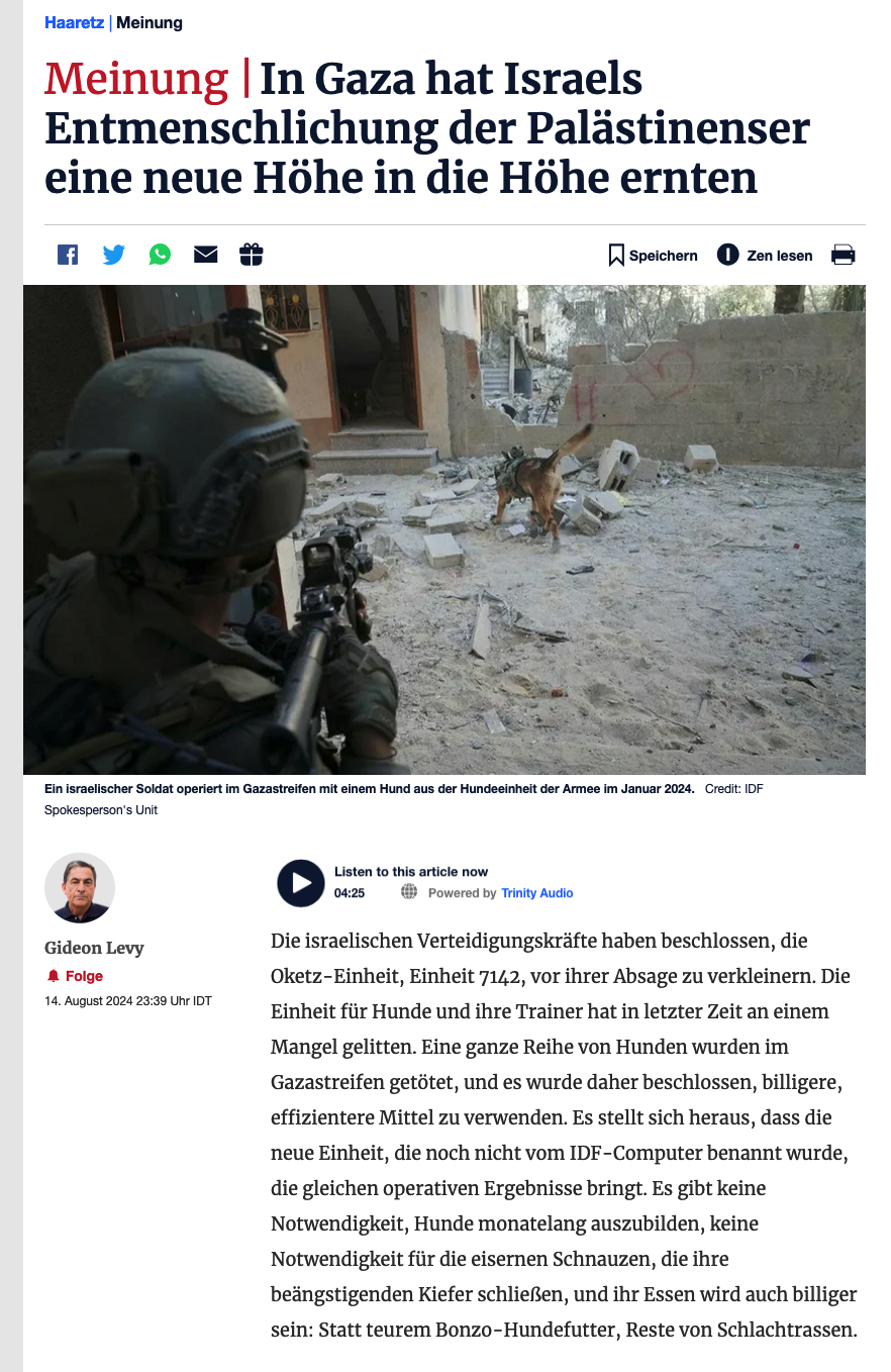 Der Prozess der Entmenschlichung der Palästinenser hat einen neuen Höhepunkt erreicht. Haaretz berichtete, dass das IDF-Seniorkommando die neue Einheit kenne. Nach Ansicht der Armee ist das Leben eines Hundes mehr wert als das eines Palästinensers. Jetzt haben wir auch die offizielle Version.