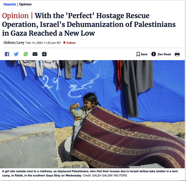 The images I saw from the hospitals in Rafah on the day of the rescue were among the most horrific I have seen in this war. Children ripped to shreds, convulsing, looking helplessly upon their deaths. The horror. There is no need to go into the moral dilemma of whether the release of two hostages justifies the deaths of 74 people – that question is superfluous in such a cruel war – in order to point to Israel's complete disregard for collateral deaths. On the day of the operation, Israel killed 133 people across Gaza, most of them, as is the norm in this war, innocent civilians, among them many children.