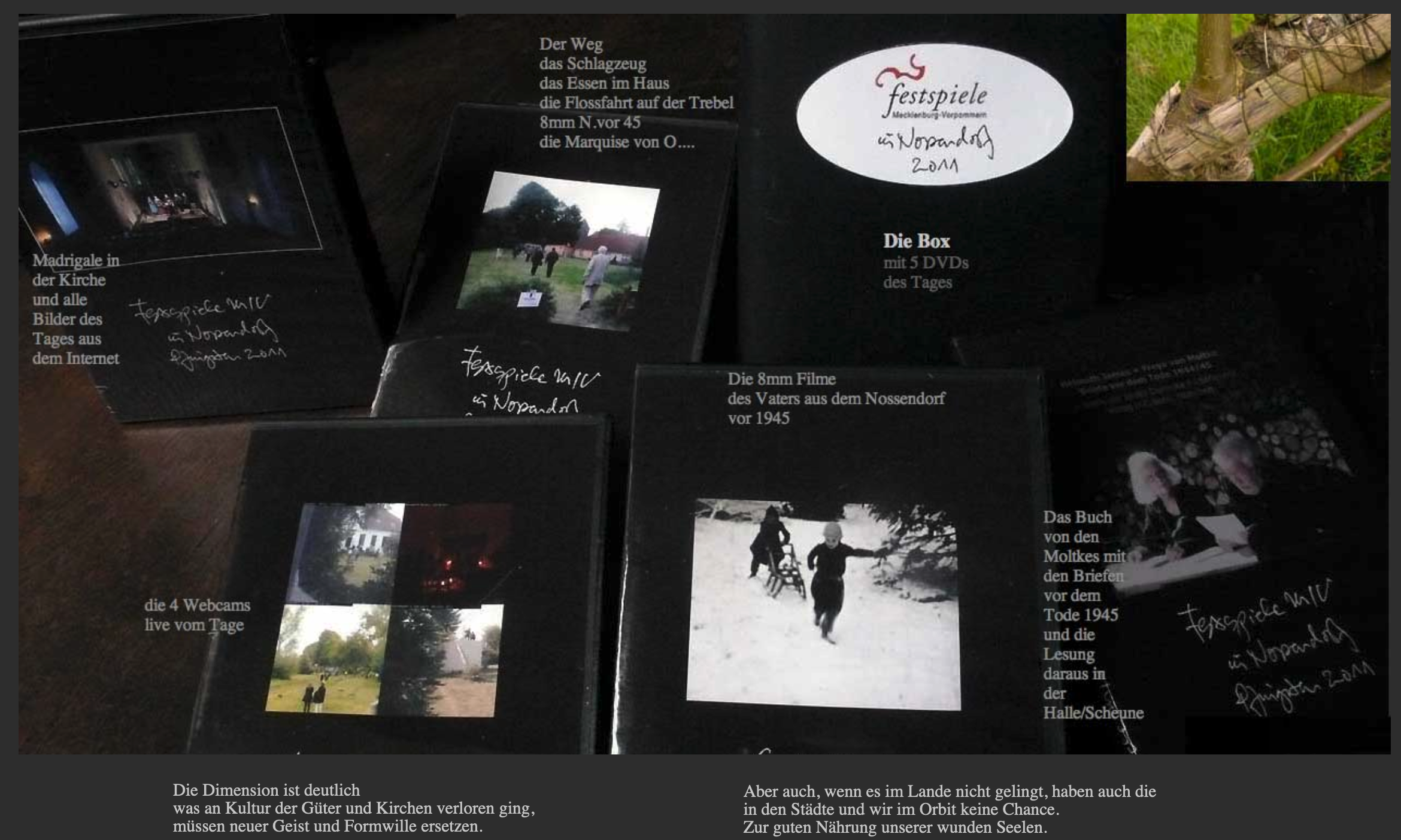 Drei Güter gab es bis 1945 in Nossendorf. Eines ist ausgelöscht und der Stadt Demmin als Eigentum nach dem Mauerfall abhandengekommen und geschleift. Das Andere soll jetzt mit EU-Mitteln (LEADER-Antrag)dh. Gelder hoffentlich vernünftig aktiviert werden. Das Dritte sind wir. Als Einziges überlebend, als hortus conclusus der Welt zugewandt.