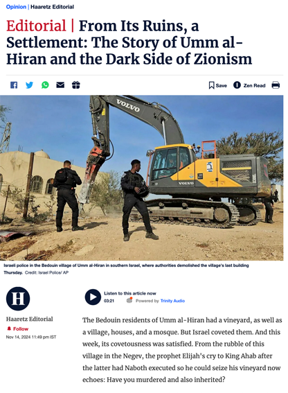 Die Beduinenbewohner von Umm al-Hiran hatten einen Weinberg sowie ein Dorf, Häuser und eine Moschee. Aber Israel begehrte sie. Und diese Woche war seine Begeisterung zufrieden. Aus den Trümmern dieses Dorfes im Negev, dem Schrei des Propheten Elia zu König Ahab, nachdem dieser Naboth hingerichtet hatte, damit er seinen Weinberg jetzt ankündigen konnte: Haben Sie ermordet und auch geerbt?