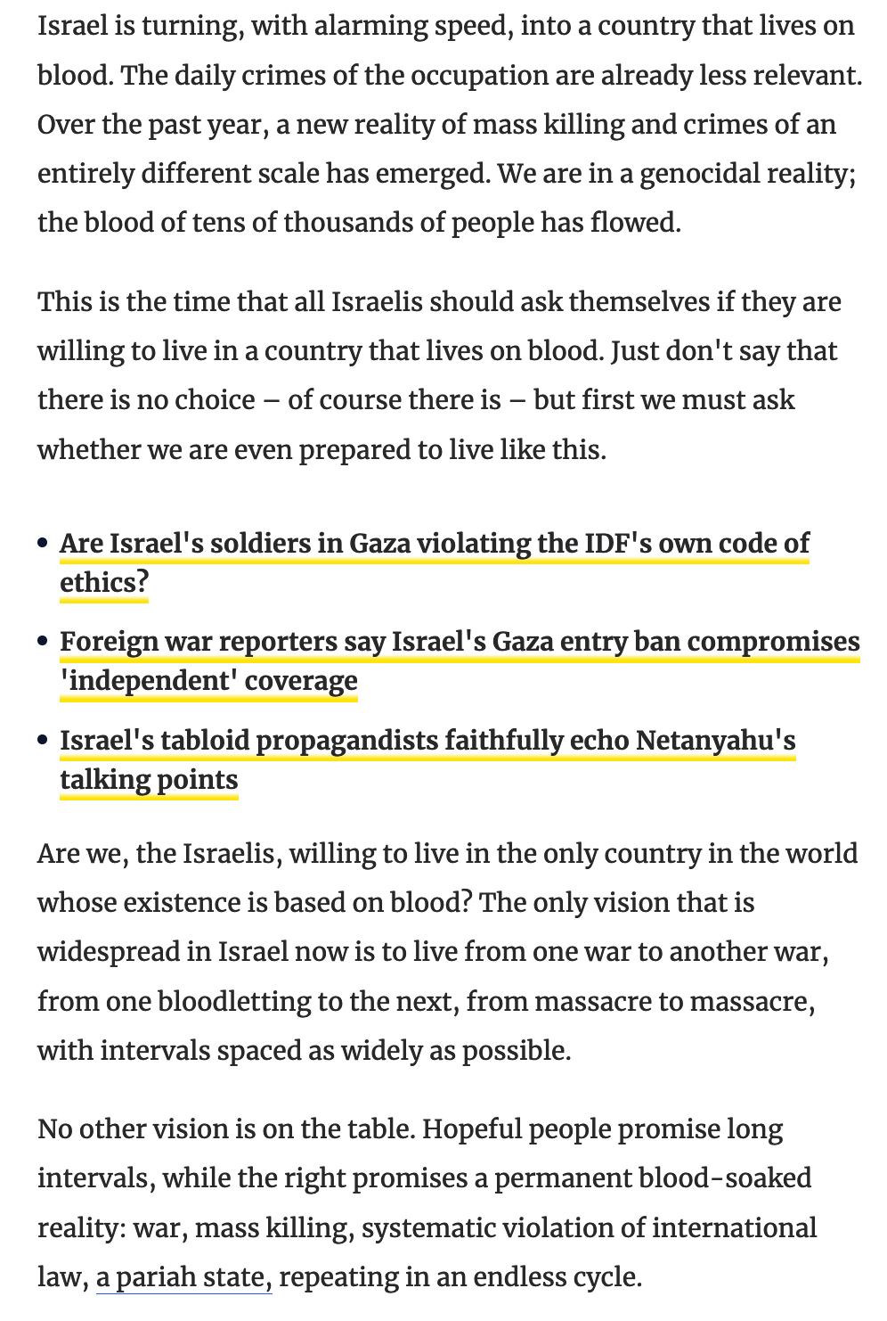 Dies ist die Zeit, in der sich alle Israelis fragen, ob sie bereit sind, in einem Land zu leben, das von Blut lebt. Sagen Sie einfach nicht, dass es keine Wahl gibt – natürlich gibt es sie – aber zuerst müssen wir uns fragen, ob wir überhaupt bereit sind, so zu leben.