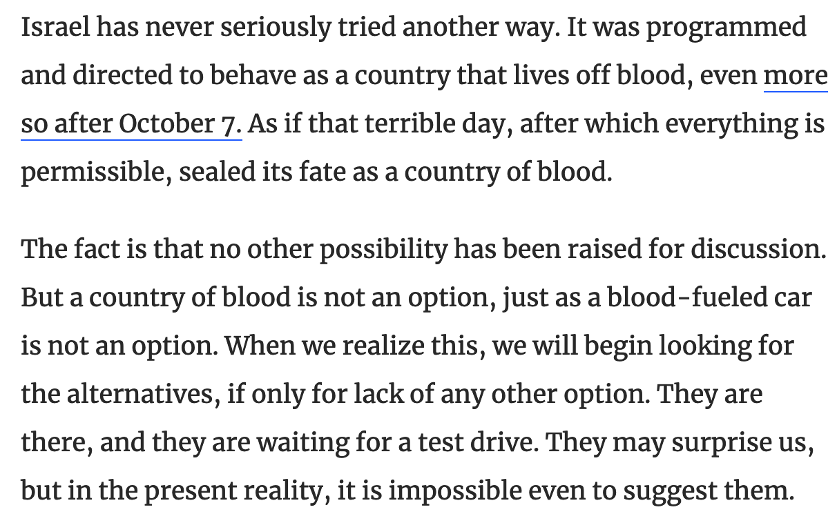 Israel hat nie ernsthaft einen anderen Weg versucht. Es wurde programmiert und angewiesen, sich als ein Land zu verhalten, das vom Blut lebt, noch mehr nach dem 7. Oktober. Als ob dieser schreckliche Tag, nach dem alles erlaubt ist, sein Schicksal als Blutland besiegelt.