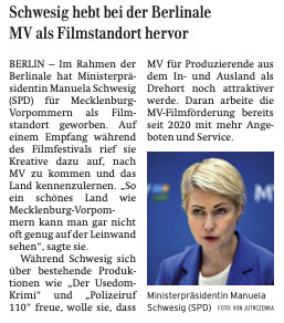 Die Provinz im Norden mit spezieller Geschichte die sich als Film-Land sehen lassen kann. Auf einem internationalem Filmfestival von Berlin. Schlecht beraten wenn nicht. Interessant wäre auch ein Karte mit Drehorten schon bisherigen Filme dort. Auch in der Geschichte. Auch zu UFA und DEFAs Zeiten. Archiv und ständige Präsenz für interessiertes Publikum würde helfen. Allein Zur Litertuar fallen Filme ein (Fontane, F.Reuter, Strittmatter, U. Johnson, Kohlhaase).Und da gibts noch solche Potenzen des Films aus MV wie M. Geschonnek und , A.Dresen