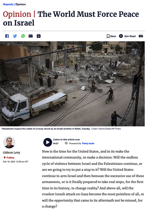 Aber die Welt kann es sich nicht leisten, diese Gelegenheit verpassen zu lassen. Dies ist die Welt, die bald mit ihren Mitteln die Ruinen des Gazastreifens rekonstruieren muss, bis Israel es das nächste Mal abriss. Es ist die Welt, deren Stabilität untergraben wird, solange die Besatzung besteht, und wird jedes Mal weiter untergraben, wenn Israel einen weiteren Krieg beginnt. Dies ist die Welt, die sich einig ist, dass die Besatzung schlecht dafür ist, aber nie einen Finger gehoben hat, um sie zu einem Ende zu bringen. Jetzt ist eine Gelegenheit dazu gekommen. Israels Schwäche und Abhängigkeit nach diesem Krieg muss auch zugunsten Israels ausgenutzt werden.