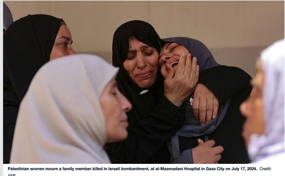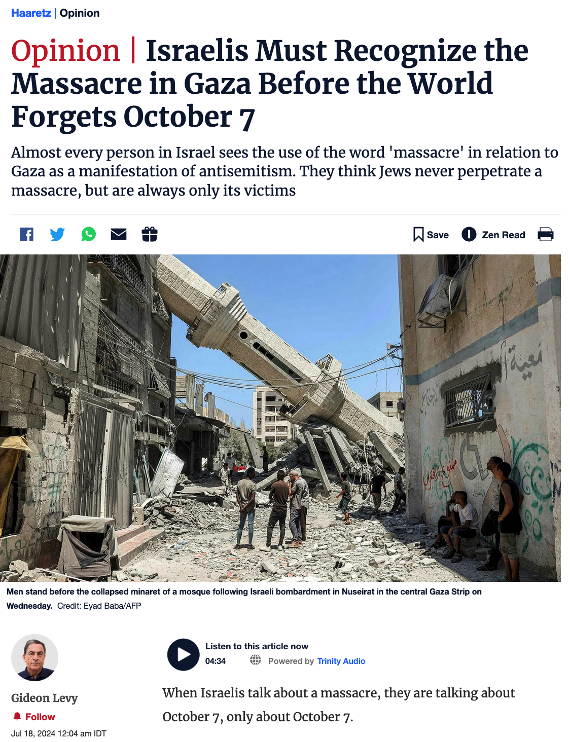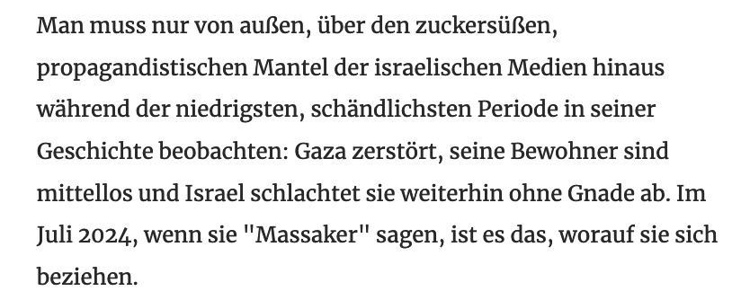 Man muss nur von außen, über den zuckersüßen, propagandistischen Mantel der israelischen Medien hinaus während der niedrigsten, schändlichsten Periode in seiner Geschichte beobachten: Gaza zerstört, seine Bewohner sind mittellos und Israel schlachtet sie weiterhin ohne Gnade ab. Im Juli 2024, wenn sie "Massaker" sagen, ist es das, worauf sie sich beziehen.