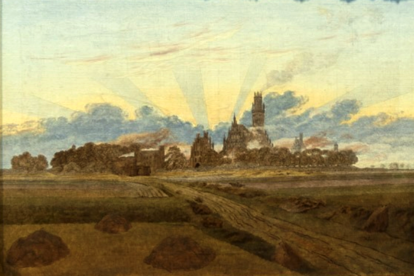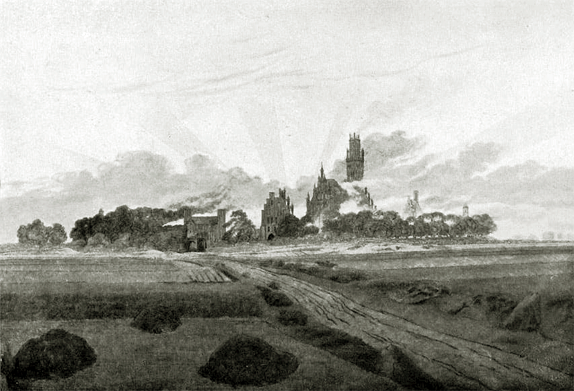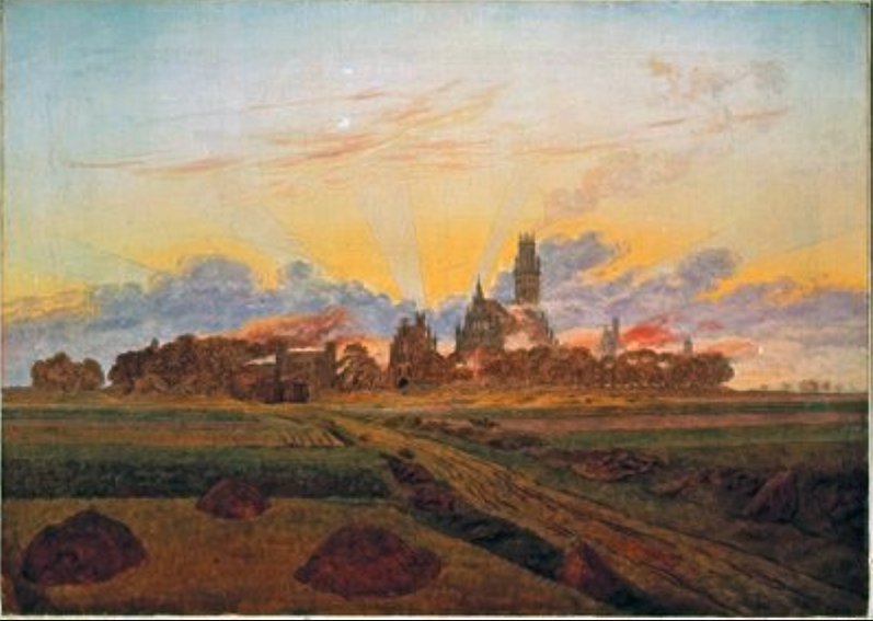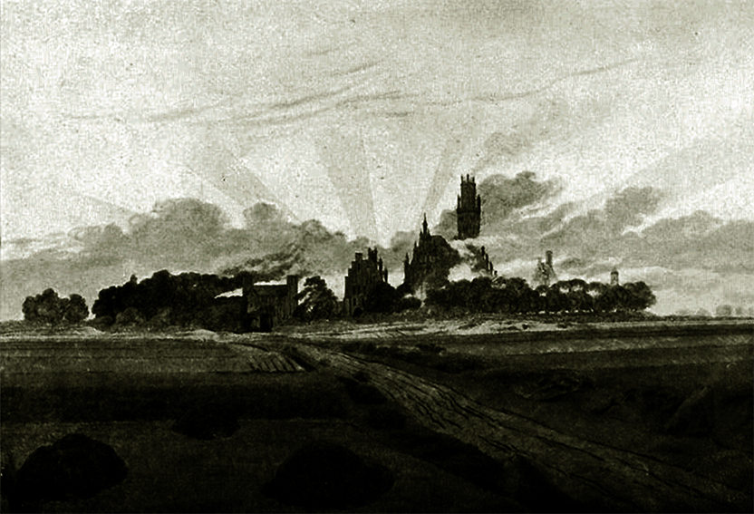 CDF hat ein Neubrandenburg der Apokalypse vorgestellt. Wir, unsere Zeit hat sie erlebt, ein Kostprobe. In Demmin mit tausend Toten - Frauen und Kindern in Wasser der Flüsse , mitten im Feuer-, Strahlen da hinter dem Turm der Kirche auch vor dem glühenden Himmel. Einen Aussenansicht der Stadt.