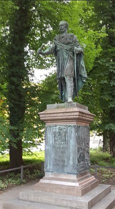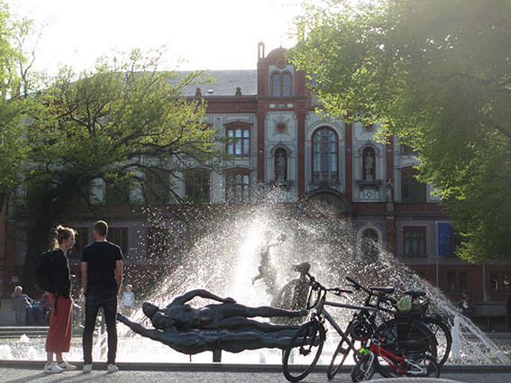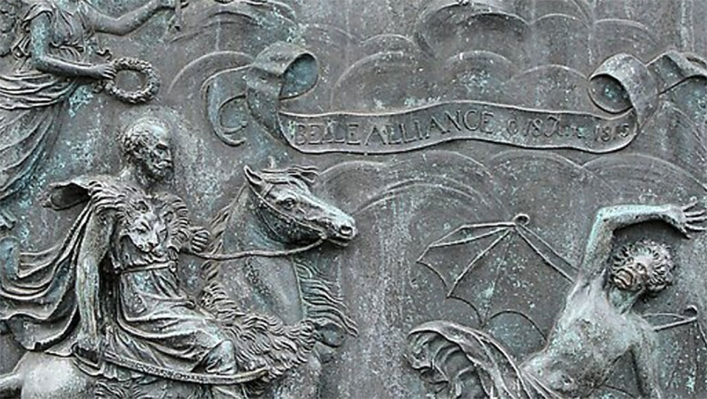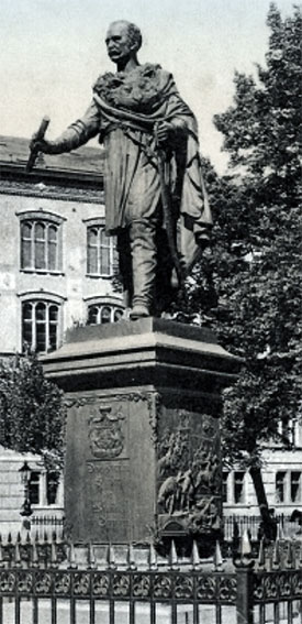 Bildhauer Schadow zog zur Konzeption des Blücher-Denkmals vor dem Universitäts-Hauptgebäude Goethe zu Rate, dessen Losung auf einer der Bronzetafeln des Sockels wie folgt zu lesen ist: