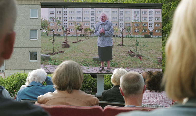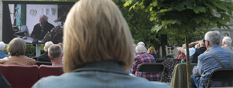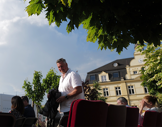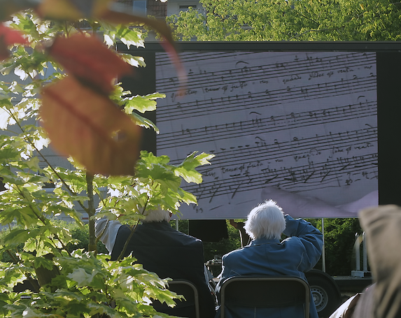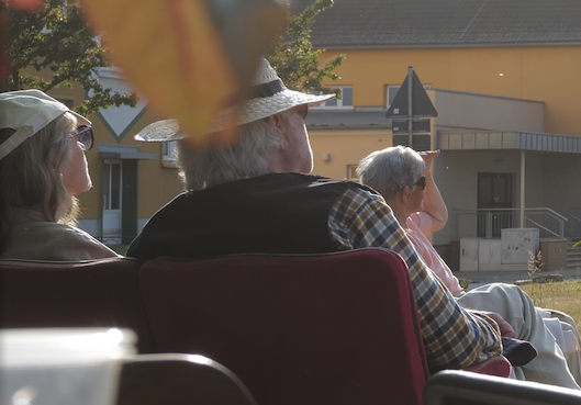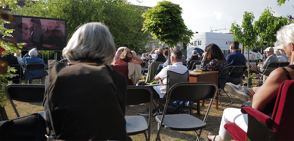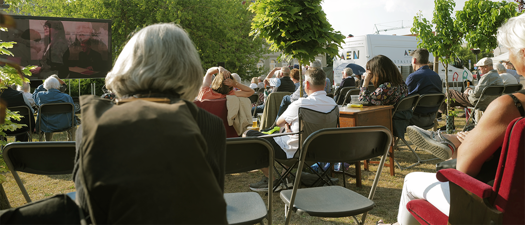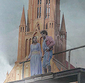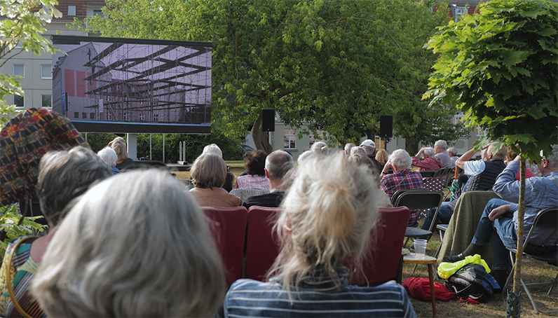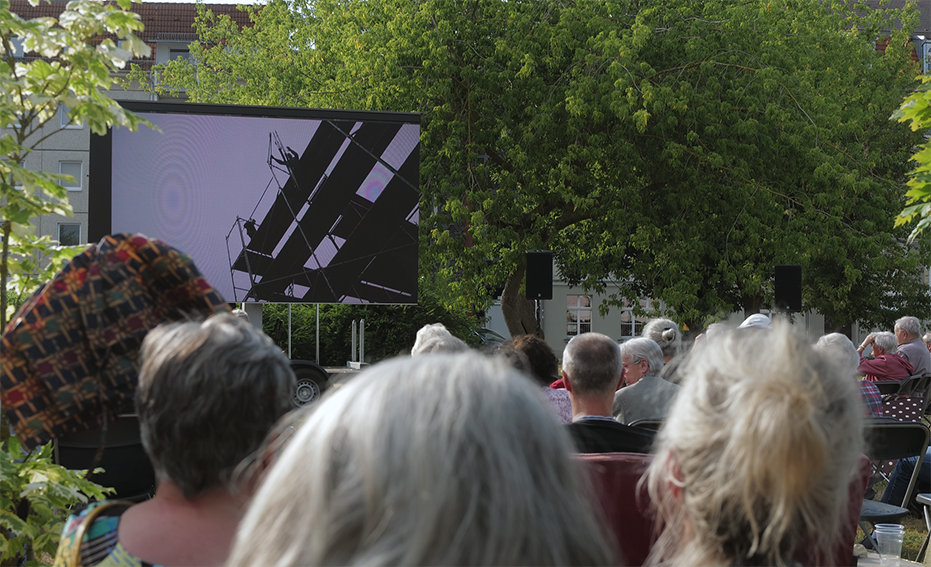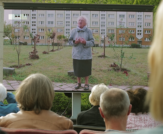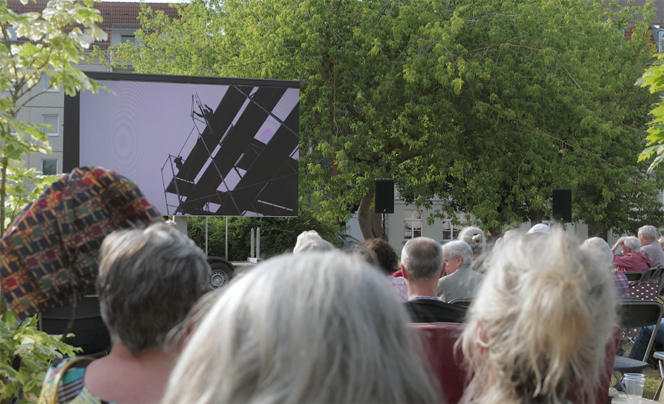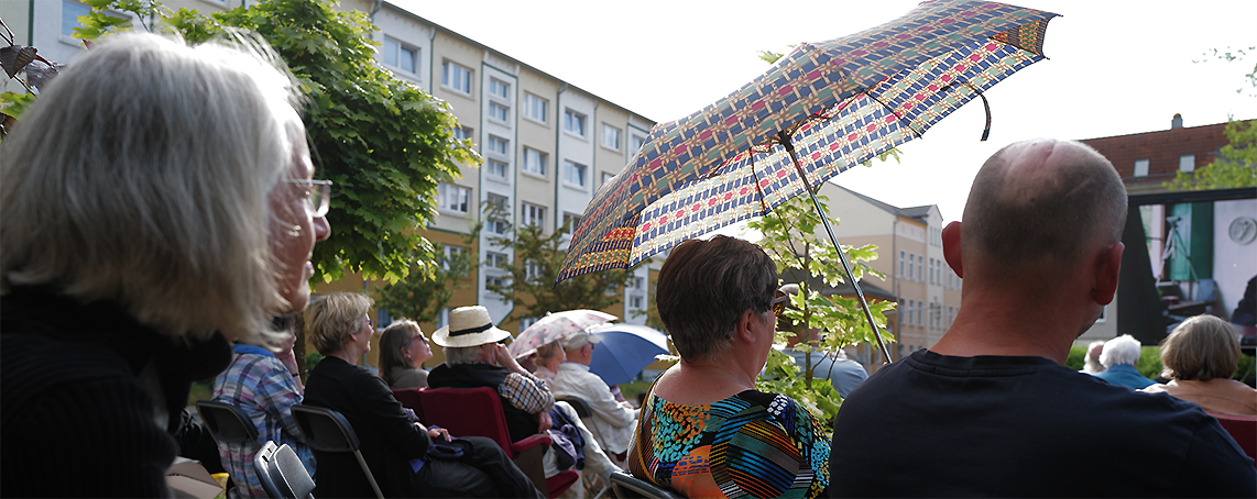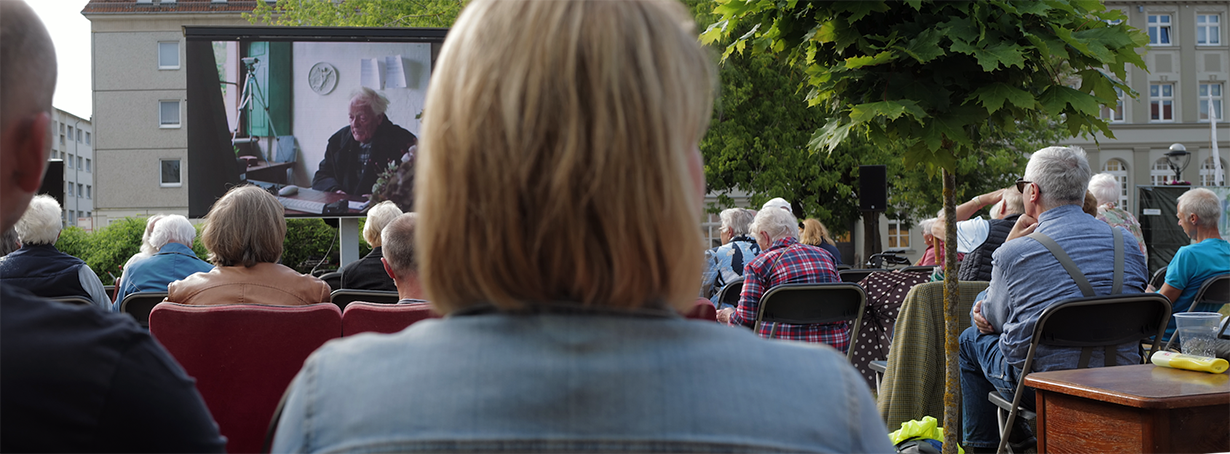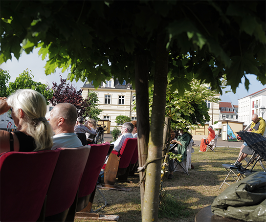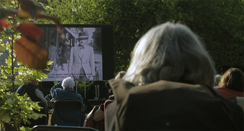 Um was geht es denn.Eine Installatuon des Gewesenen final, nochmal, von Häusern Fassaden am Markt und Musik von hier, Requien und Lieder Selbstgesungenes und gespielt auf altem Harmonium, Klavier und UFA-Schlager.