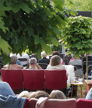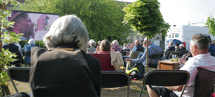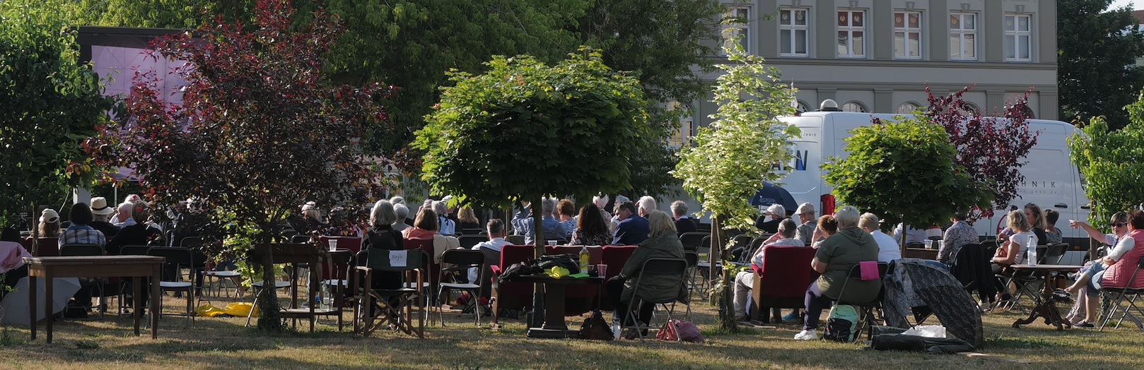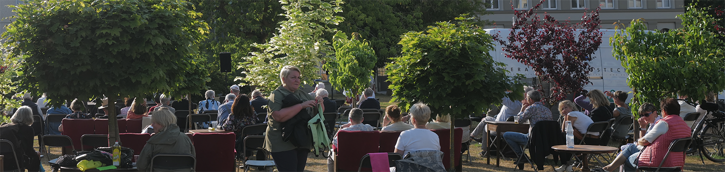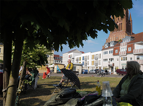 Und das unter halbschattigen Bäumen mit Sonne, der untergehenden in den Abend und Regen, dem warmen des Sommers, unter Schirmen an Tischen trinkend, zu sitzen, mit Fahrrädern voorbei locker mal schauend.