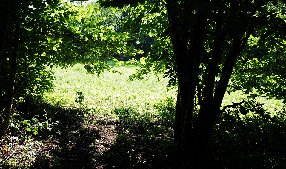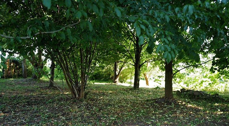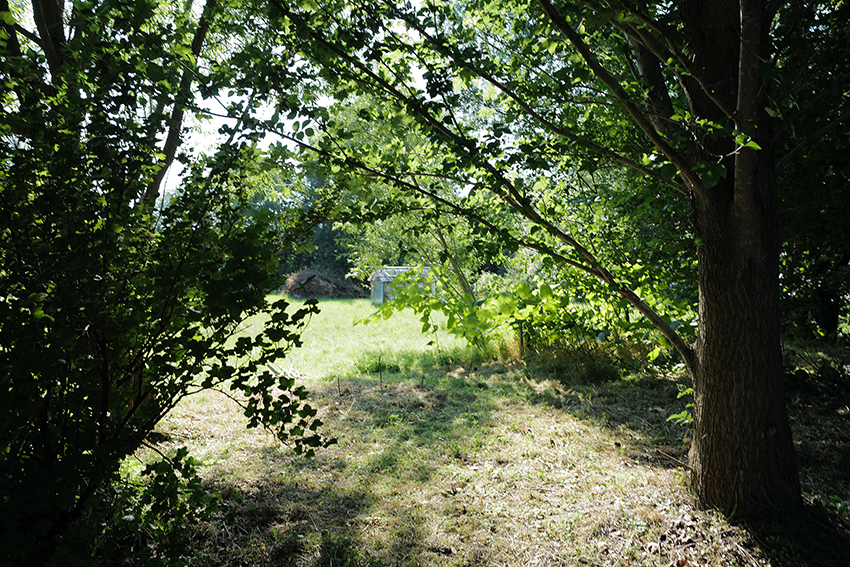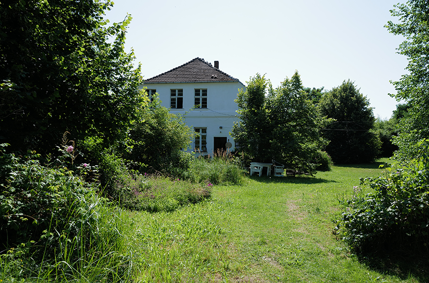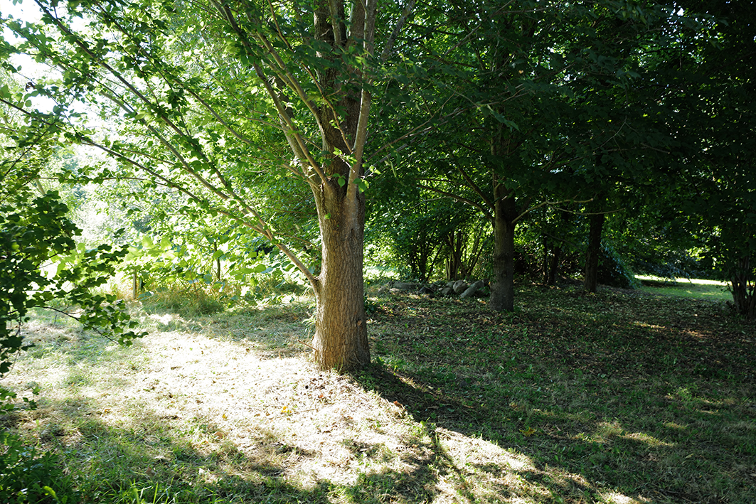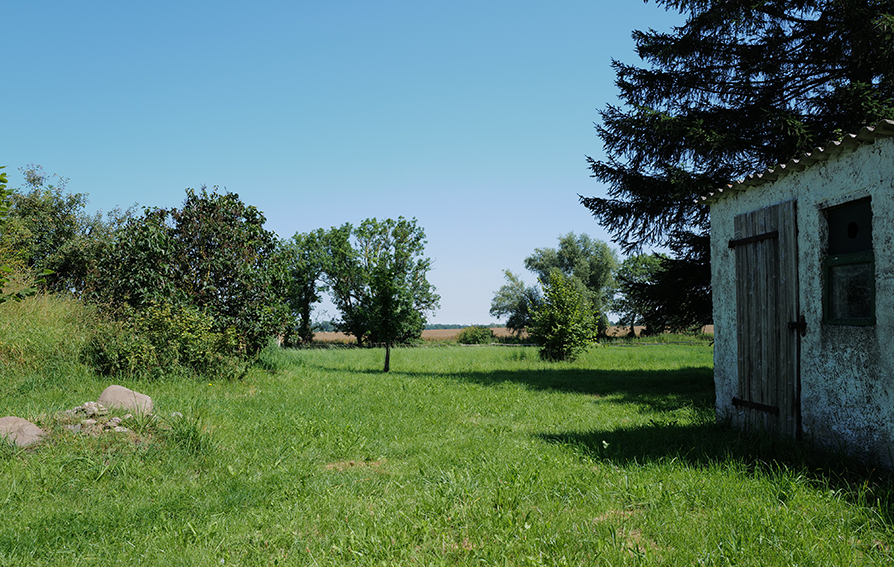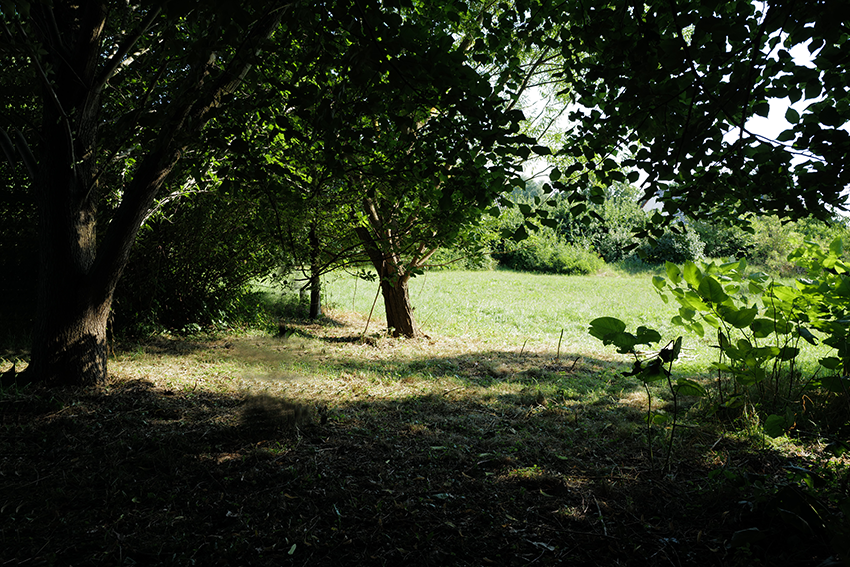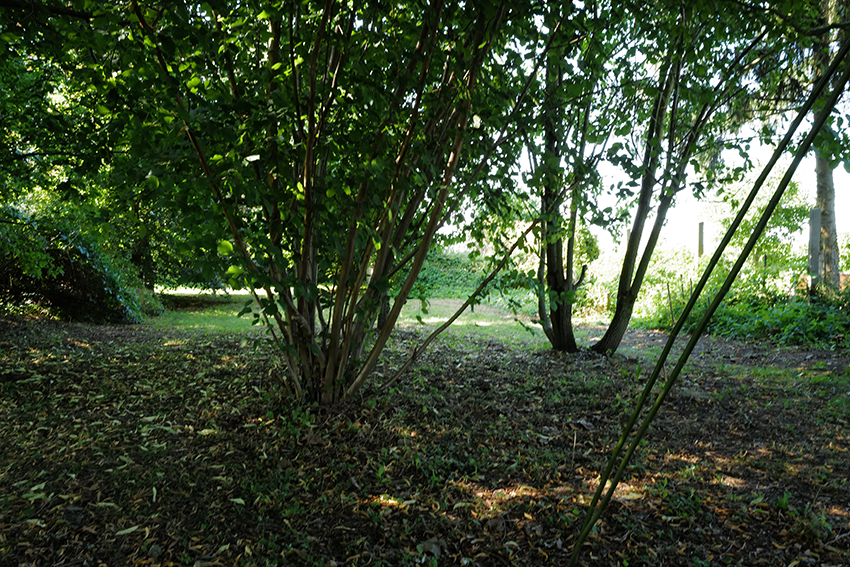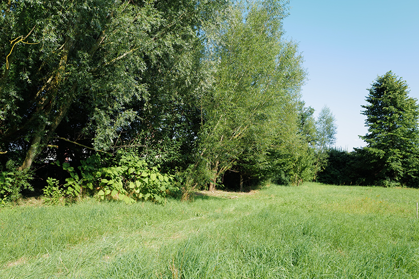 Aus dem wiederentstanden Randgestrüpp einer ehemaligen Grabenvegetation ist eine lichte Parkanlage als freundlicher Saum der Garagengärten des ehemaligen Kaphofs in der Gesamtanlage des Kultivierungsprojekts Nossendorf geworden.