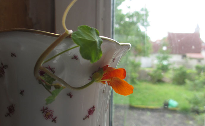 Die Kapuzinerkresse, die jetzt langsam aufgeht nach der Saat, hier überwentert , blühend vom letrzten Herbst in der Küche am Fenster der Sonne.