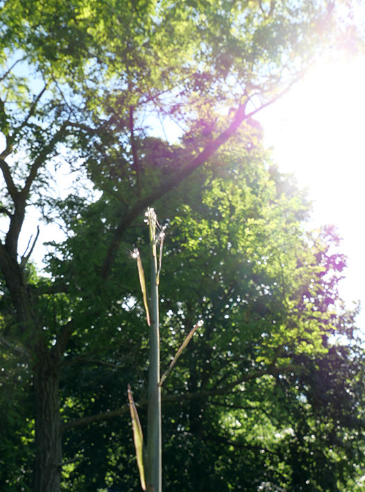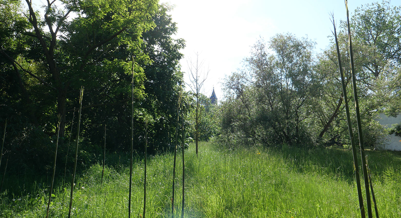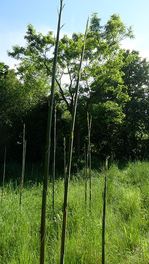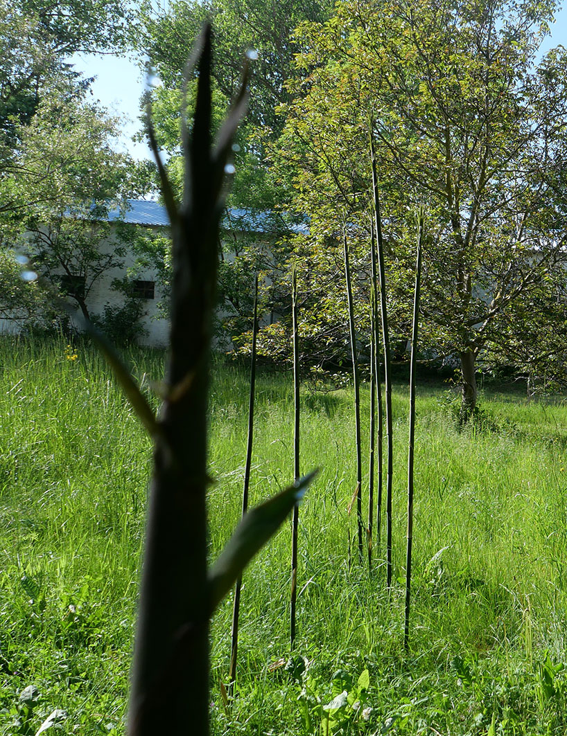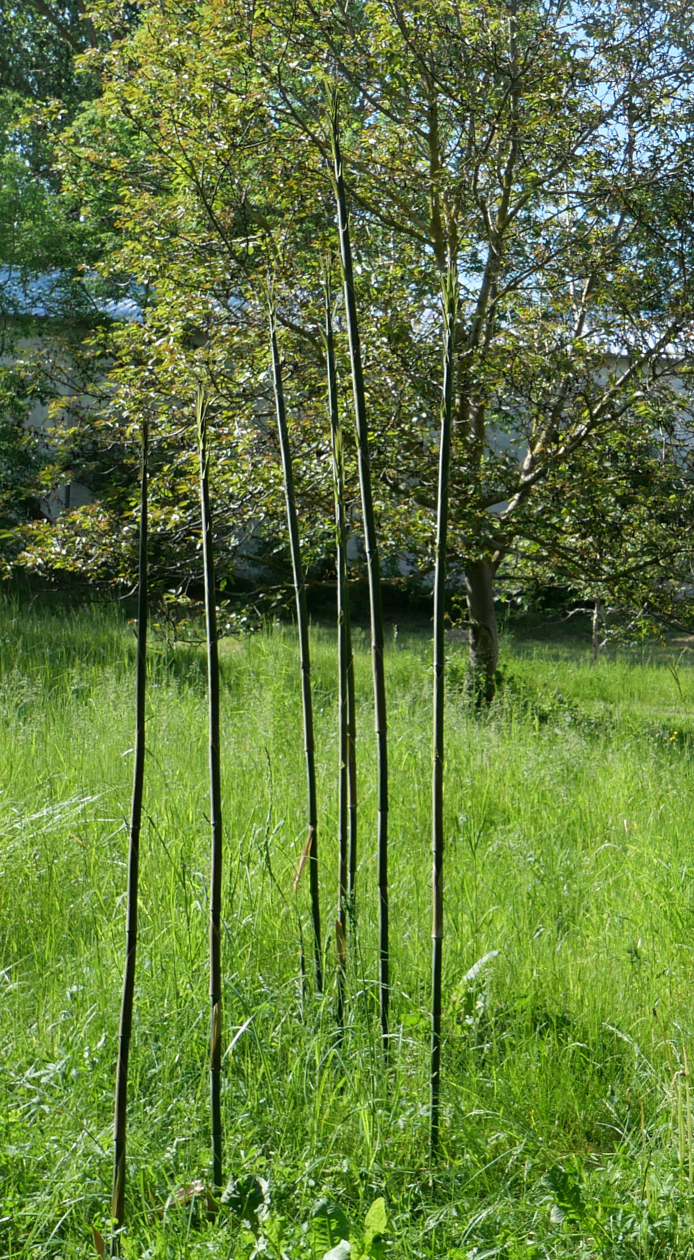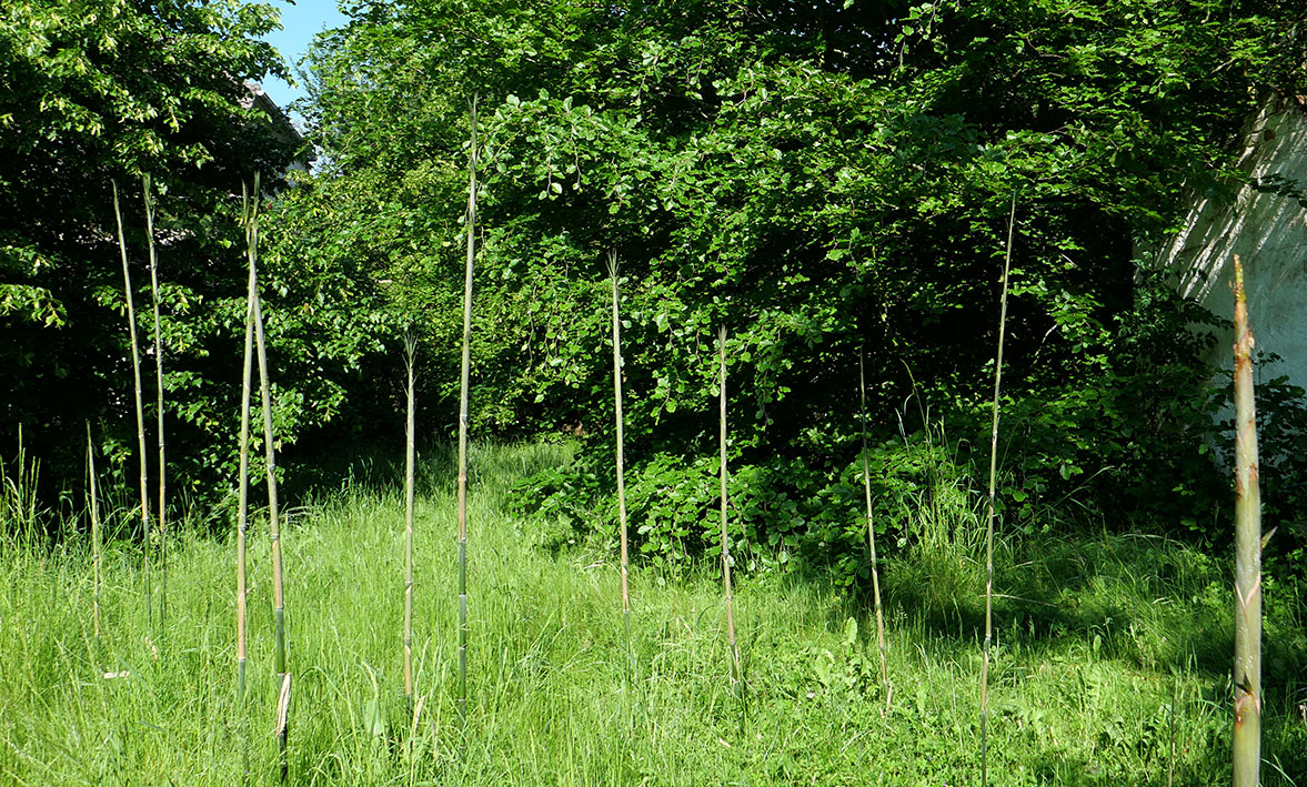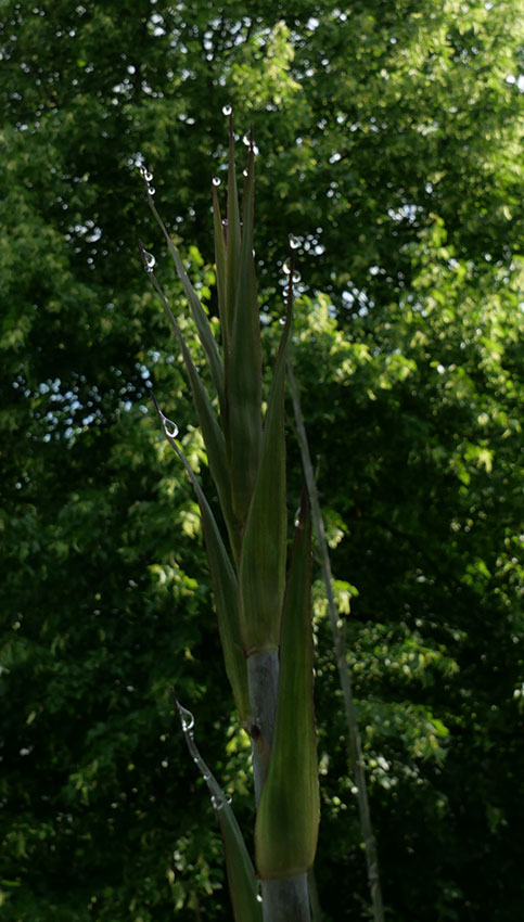 Die Triebe des Bambus, aus München, einen davon fingerdick und leicht in der Hand mitgebracht, zum Schutz wo Bäumem verboten wurden, drängen nun unter die durchgebrachten Bäume. Zuviel. An den Spitzen entstehen glitzerne Tropfen nach oben.